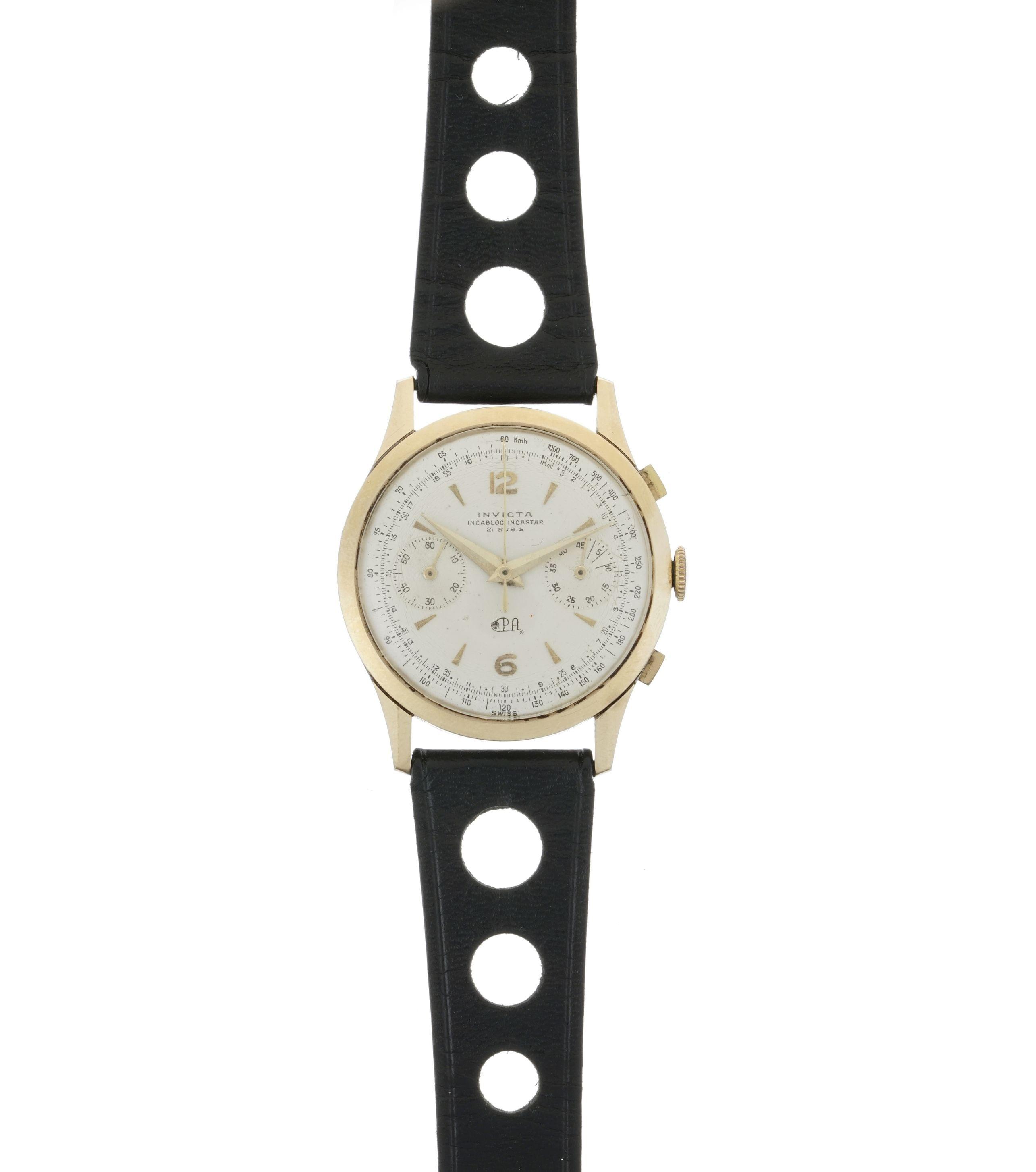 Cadran doré, aiguilles et chiffres arabes noirs, secondes à 6h,...