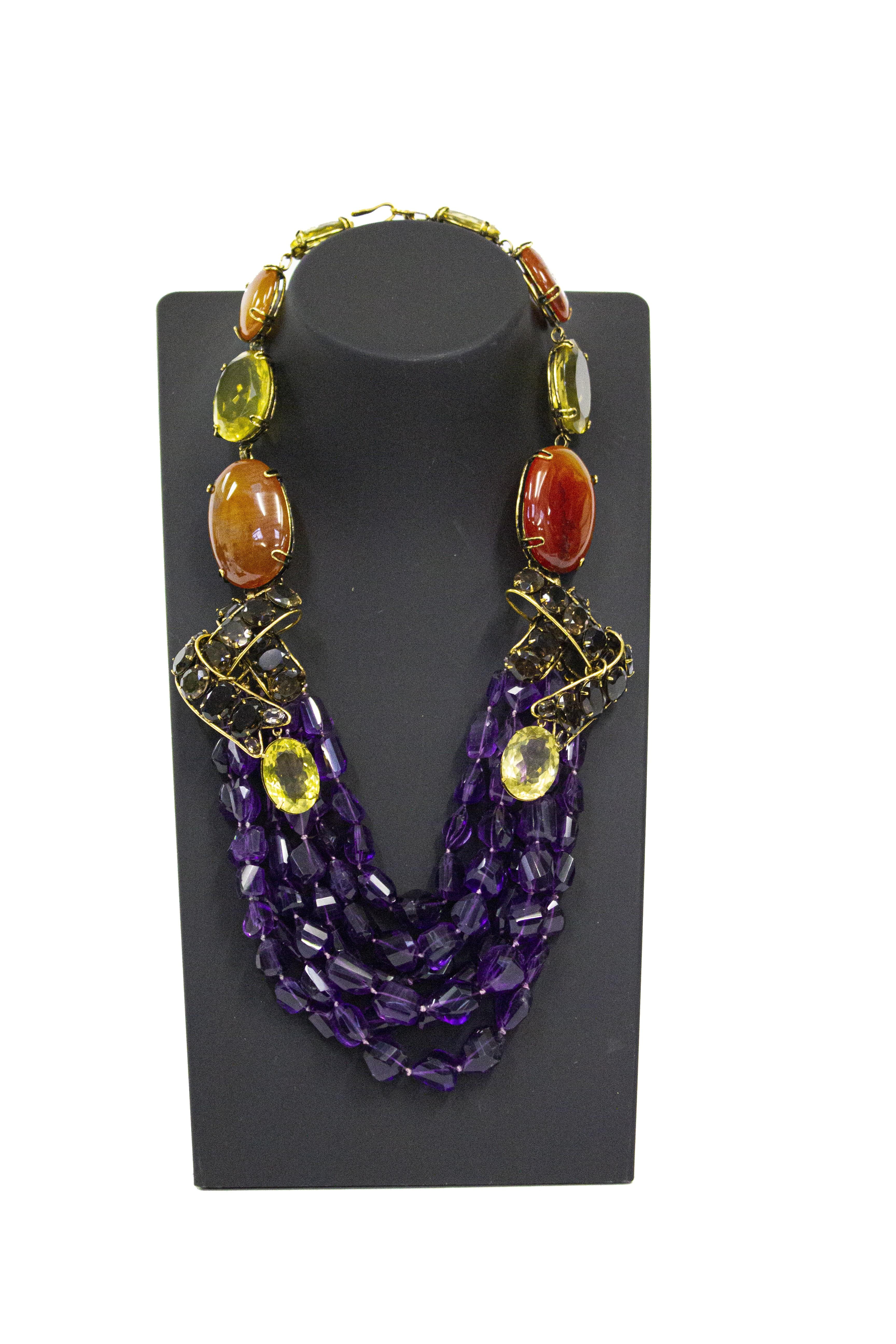 3129. Iradj Moini, attr. à, lot d'un collier multi-rangs d'améthystes serti de diverses pierres dont agate, quartz fumé et citrine
