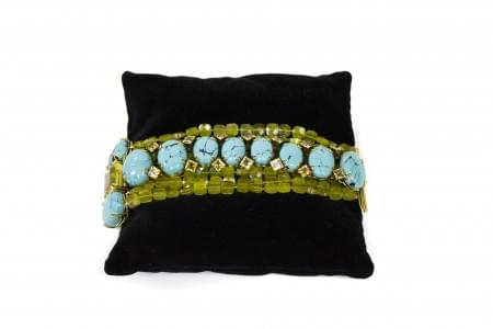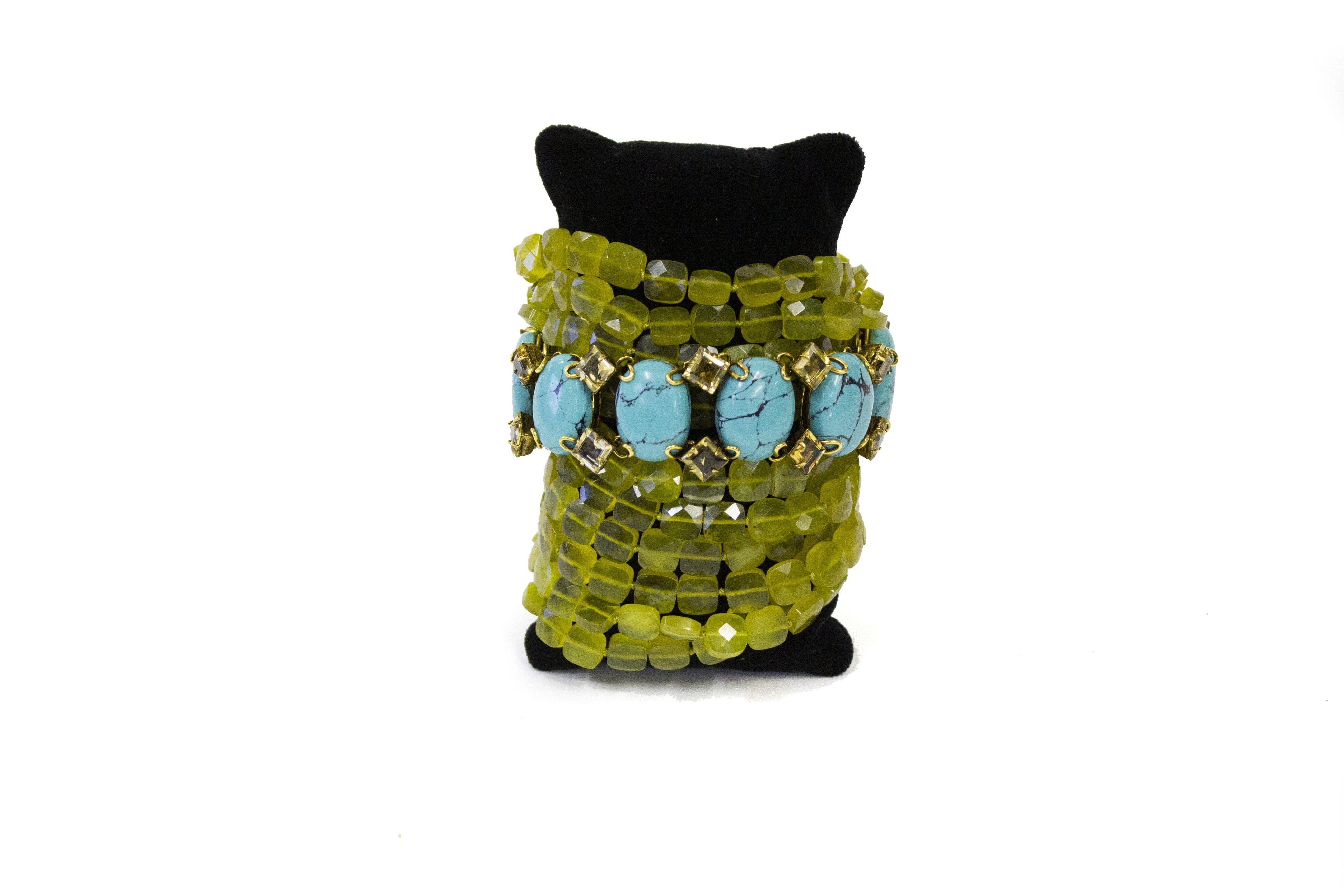 3116. Iradj Moini, bracelet multi-rangs de pierres vertes rehaussées d'une ligne de howlites et de pierres d'imitation, et terminé par un fermoir serti d'une citrine carrée