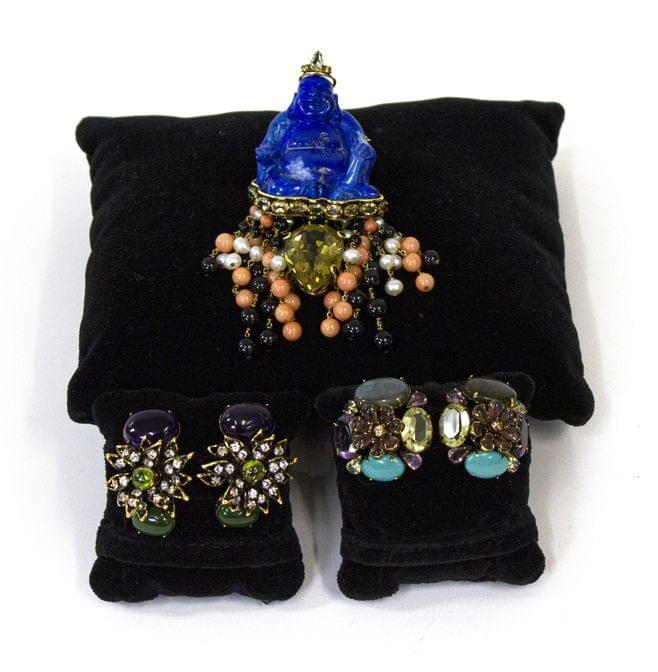 3154. Iradj Moini, lot d'une broche à motif de bouddah en lapis lazuli et de deux paires de clips d'oreilles sertis de diverses pierres