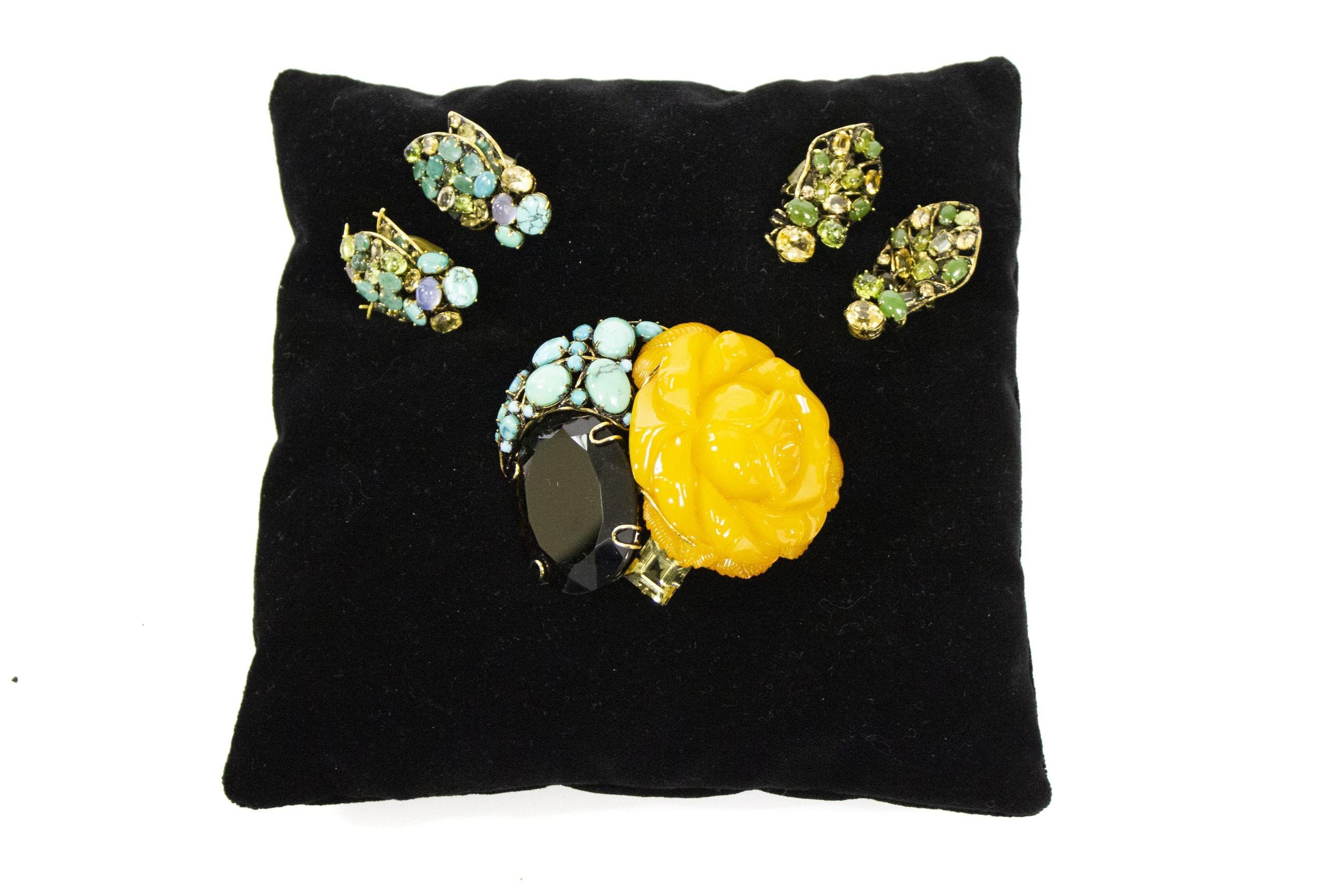3185. Iradj Moini, lot d'une broche et trois paires de clips d'oreilles serties de diverses pierres