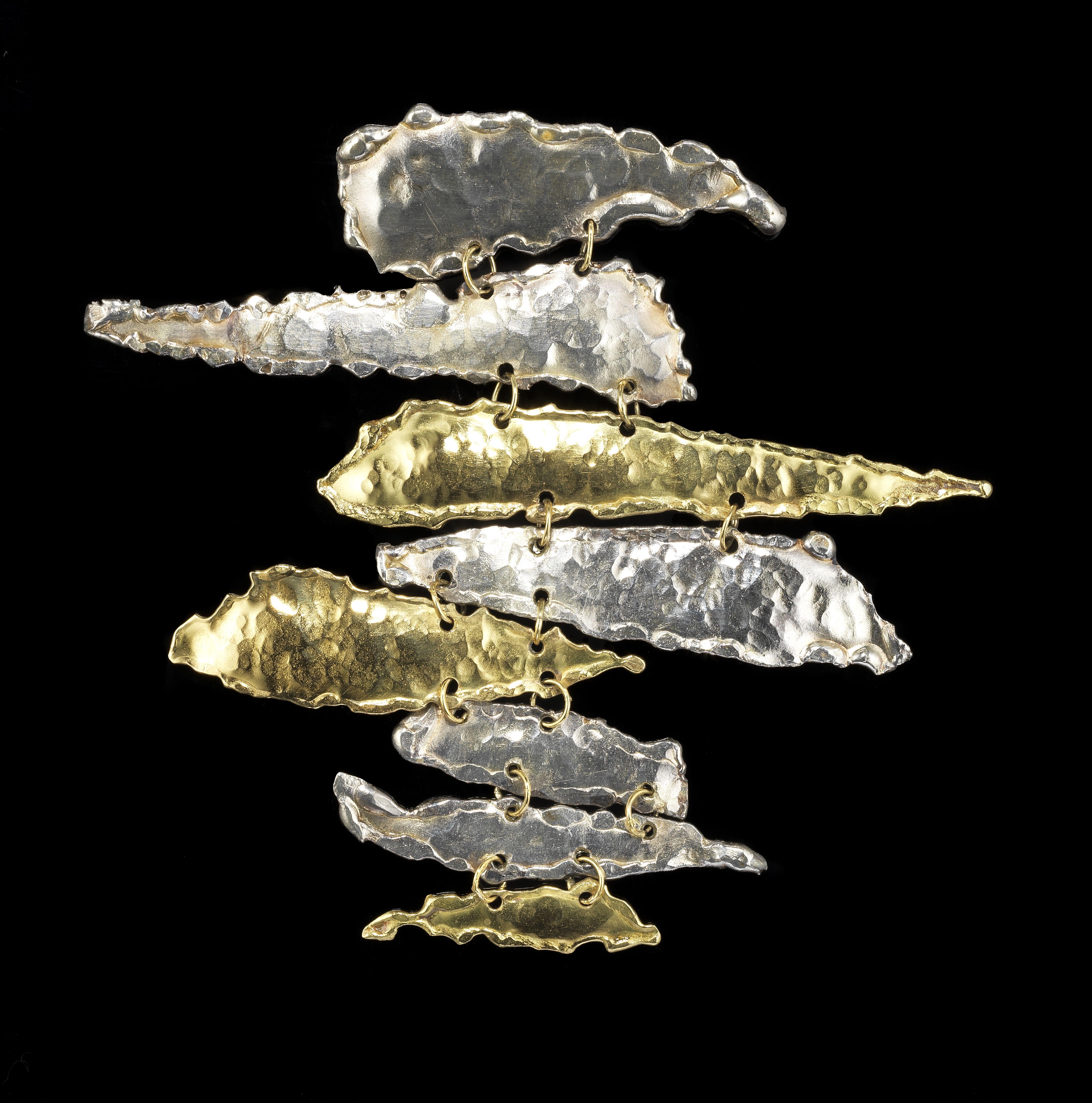 Broche „brutaliste“ composée de huit motifs articulés bicolores à effet froissé, vers 1970, argent 925 et or 750, signée, env. 10x10 cm. Irena Brynner est une artiste américaine d'origine russe, dont l'œuvre s'inscrit dans le mouvement moderniste américain. Certaines de ses créations sont exposées au Smithsonian American Art Museum ou encore au Musée d'Art et d'Histoire de Genève.