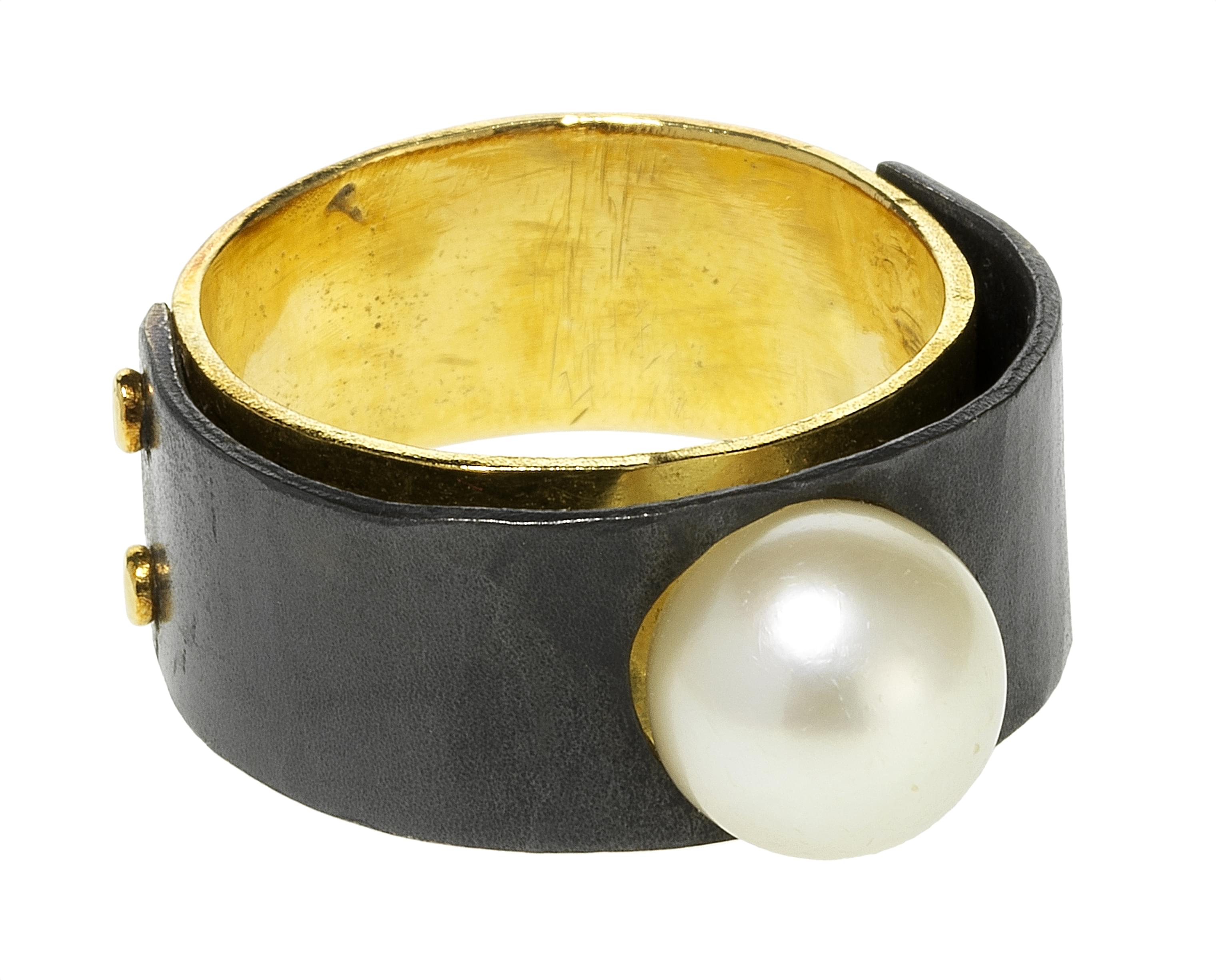 3162. Irena Brynner, bague stylisée centrée d'une perle (D env. 8 mm)