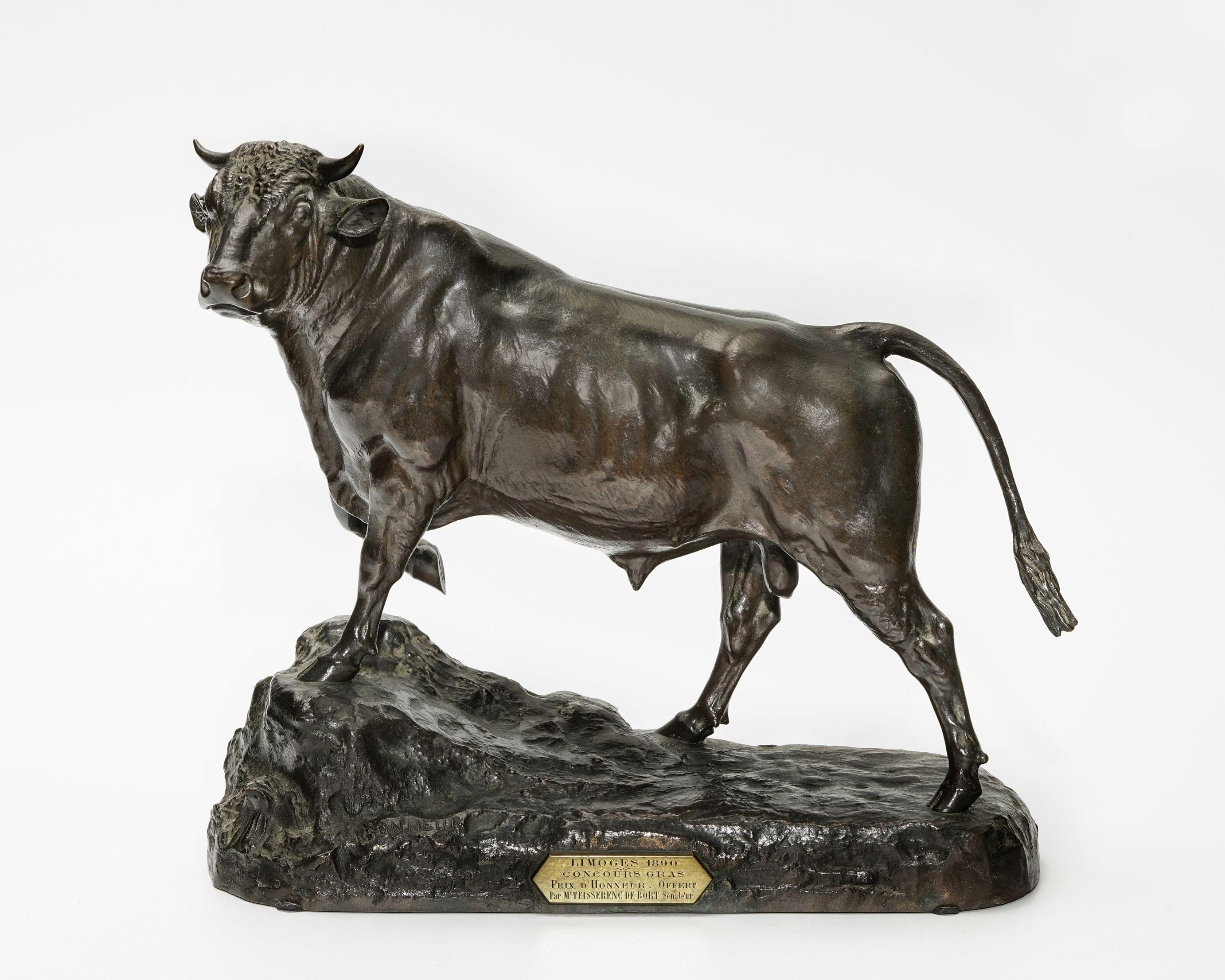 Taureau, bronze à patine brune, signé, prix d'honneur offert par Monsieur Teisserenc de Bort, sénateur, concours gras Limoges 1870, 31x35 cm