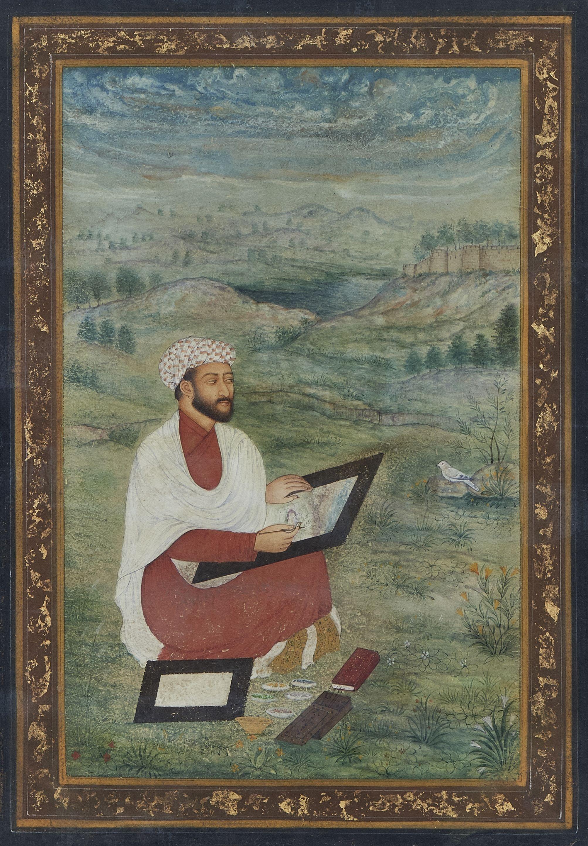 Miniature figurant un peintre, pigments sur papier, 27x19,5 cm