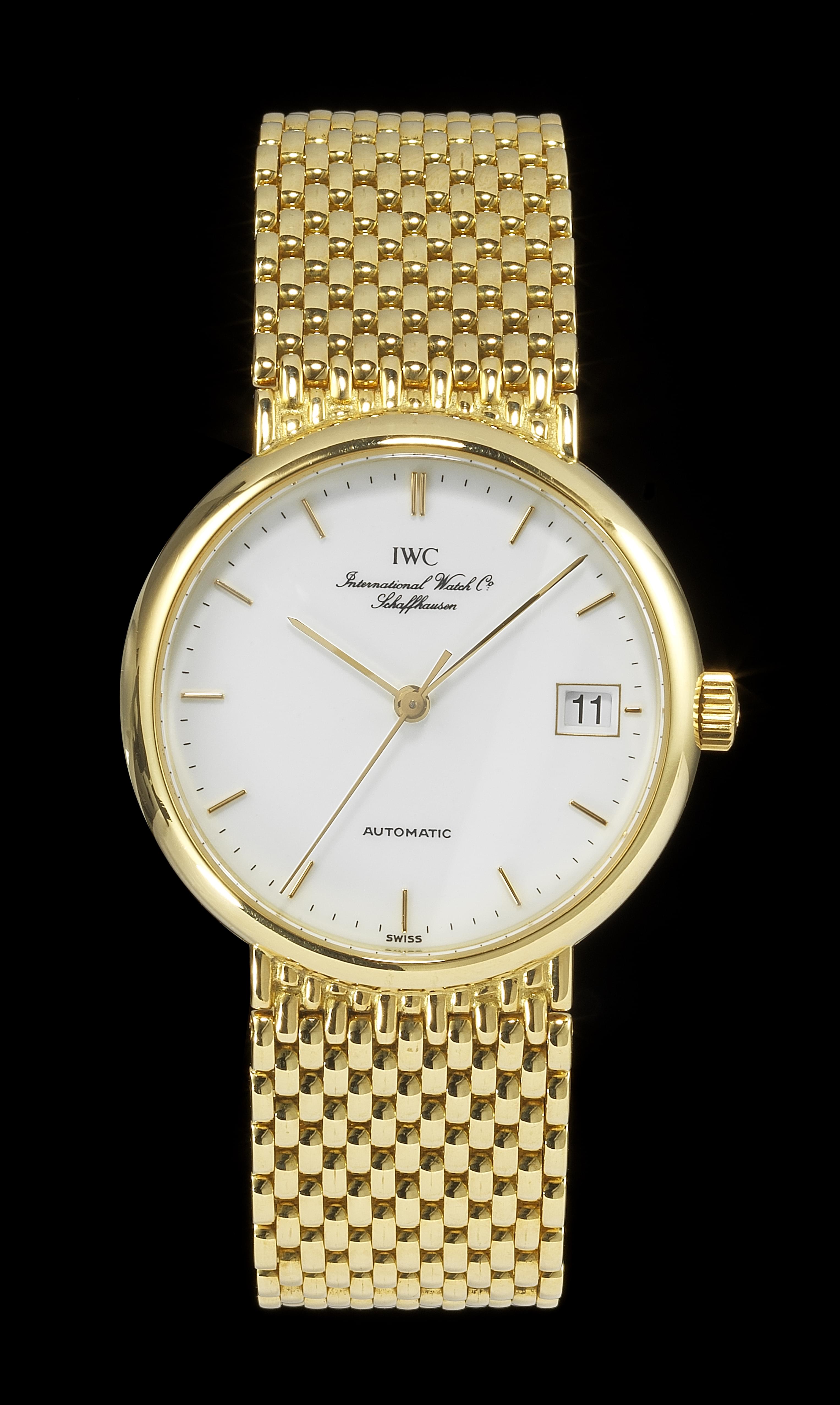 Cadran blanc, aiguilles et index bâtons dorés, date à guichet à 3h, or 750, D 38 mm, poids brut 111 g