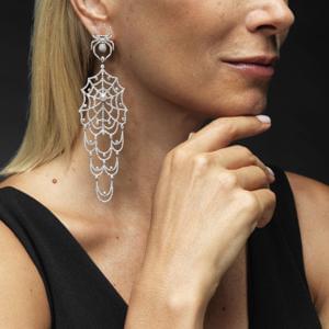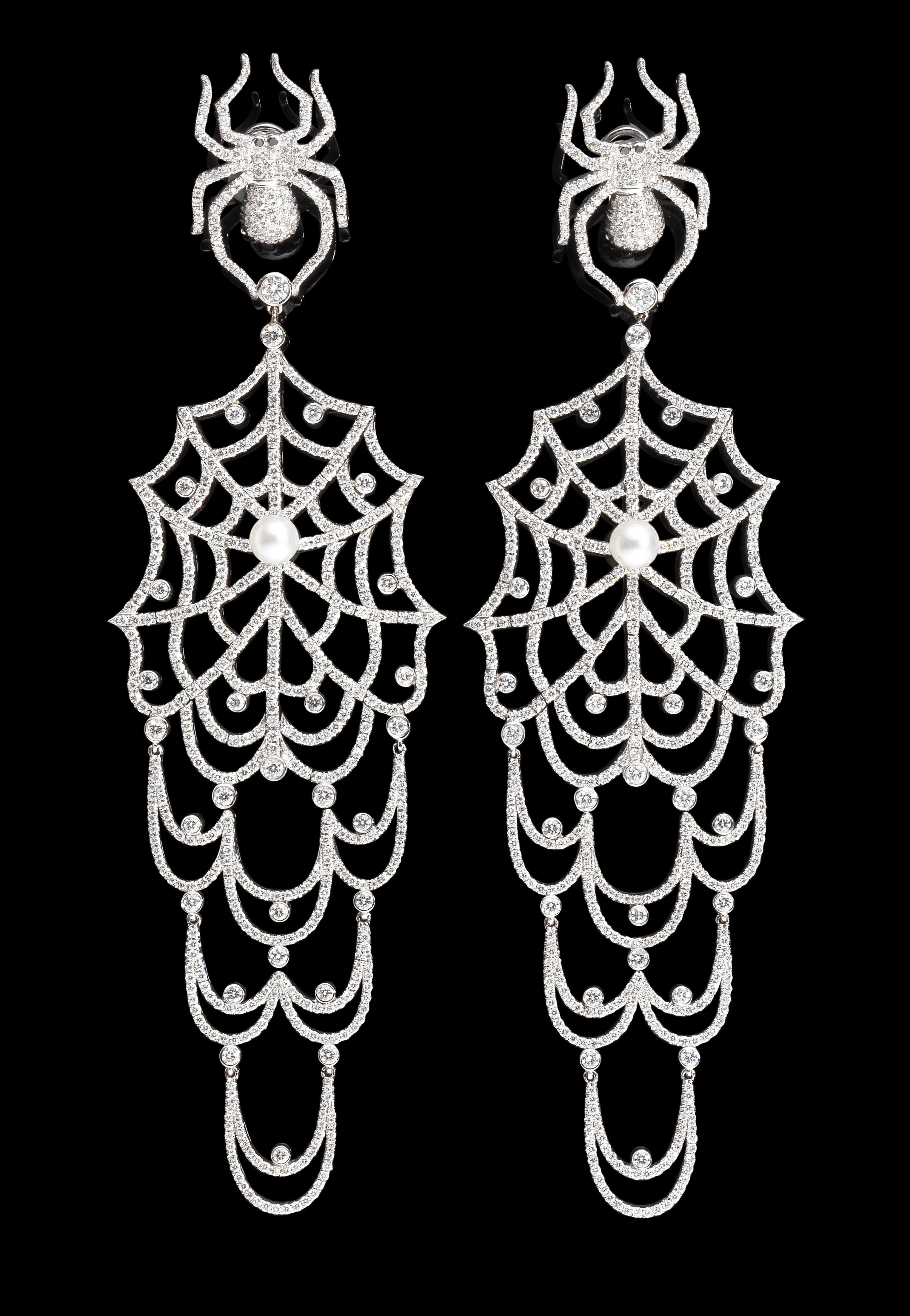 209. Jacob&Co, longs pendants d'oreilles souples à motif d'araignées retenant une toile pavée de diamants (env. 8 ct) et centrée d'une perle (D