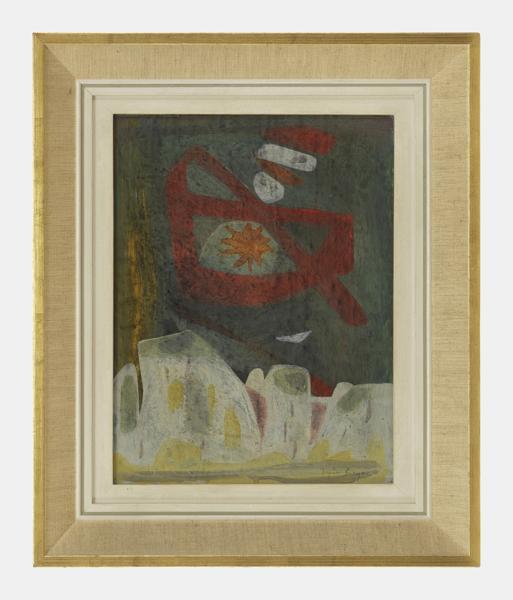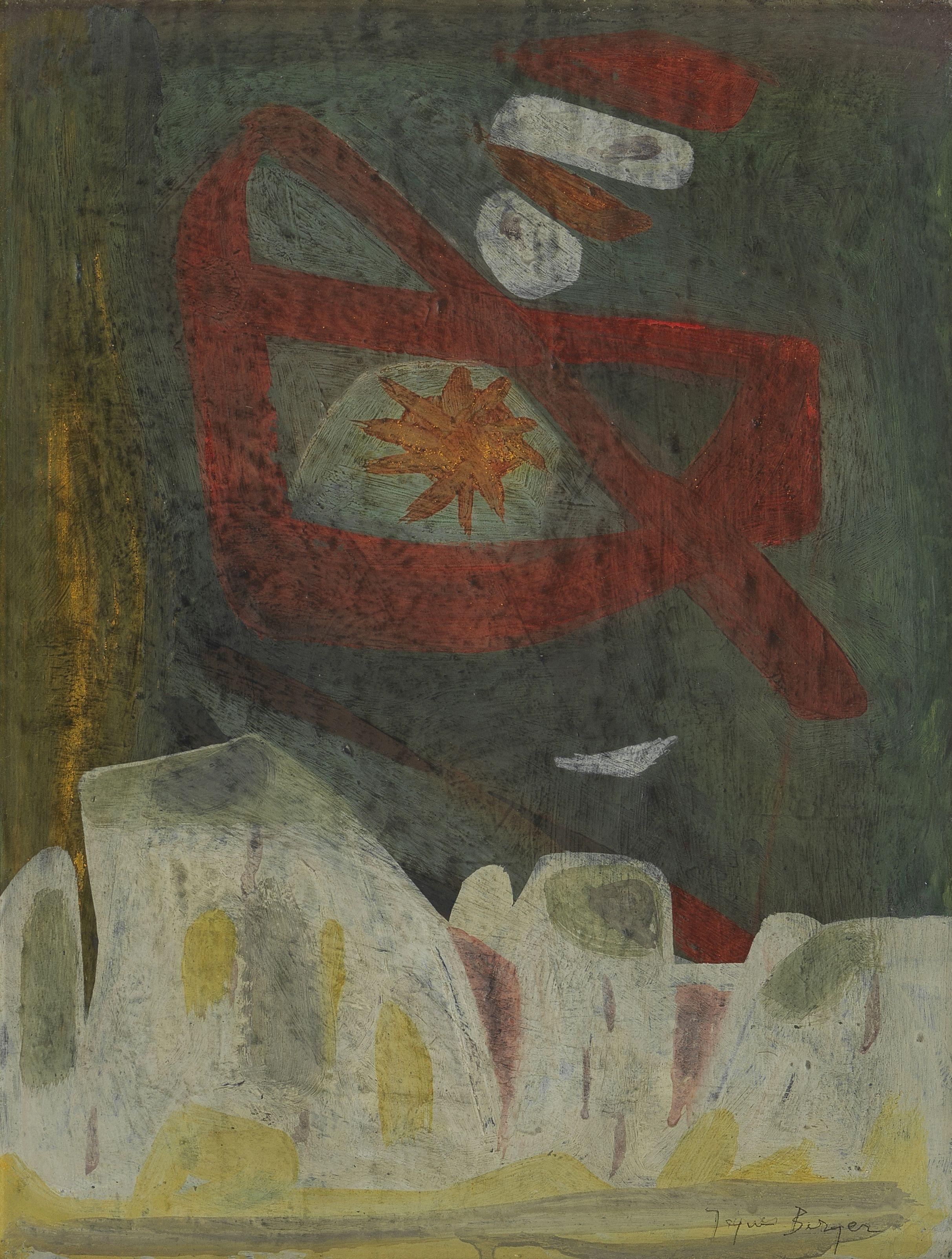 Composition abstraite, composition sur fond bleu, gouache sur carton, signée, 28x22 cm