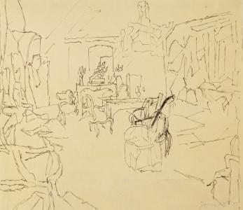 Intérieur cosy, encre sur papier, signée, 31x36 cm. Collection B...