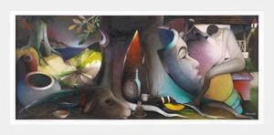 Jeune homme nu dans un paysage surréaliste, huile sur toile, sig...