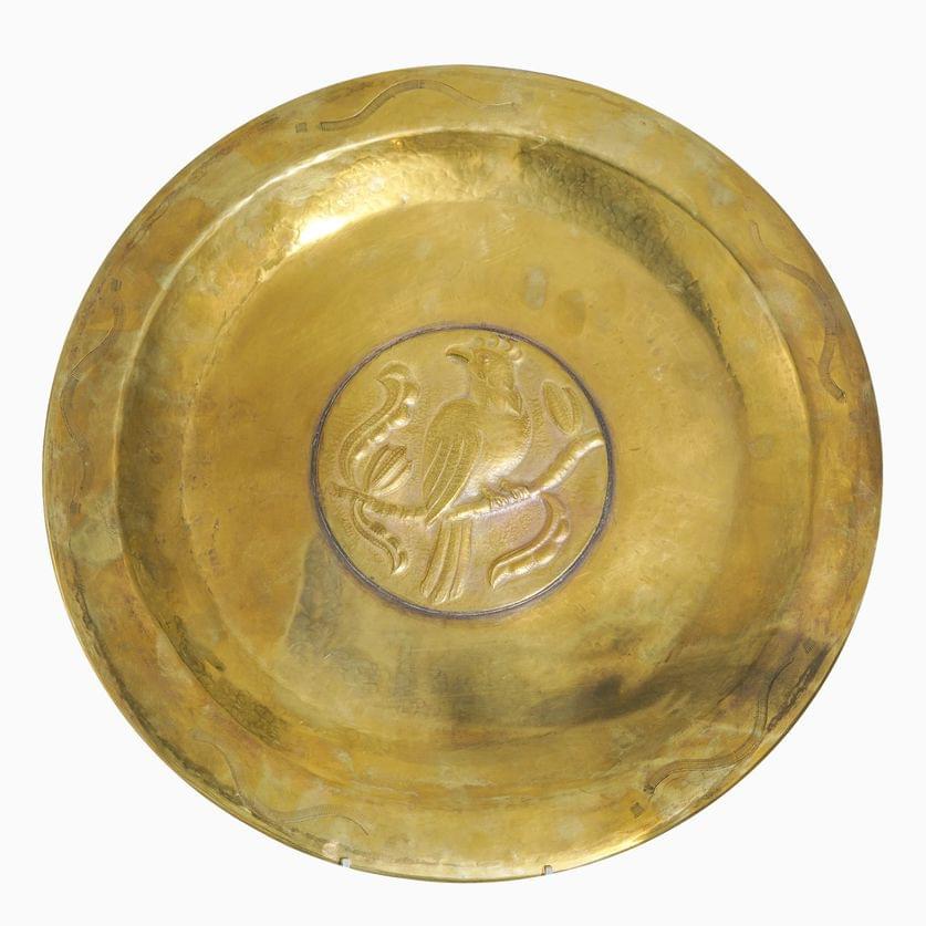 Plat à décor d'un perroquet dans un médaillon, laiton repoussé, poinçonné, D 35 cm