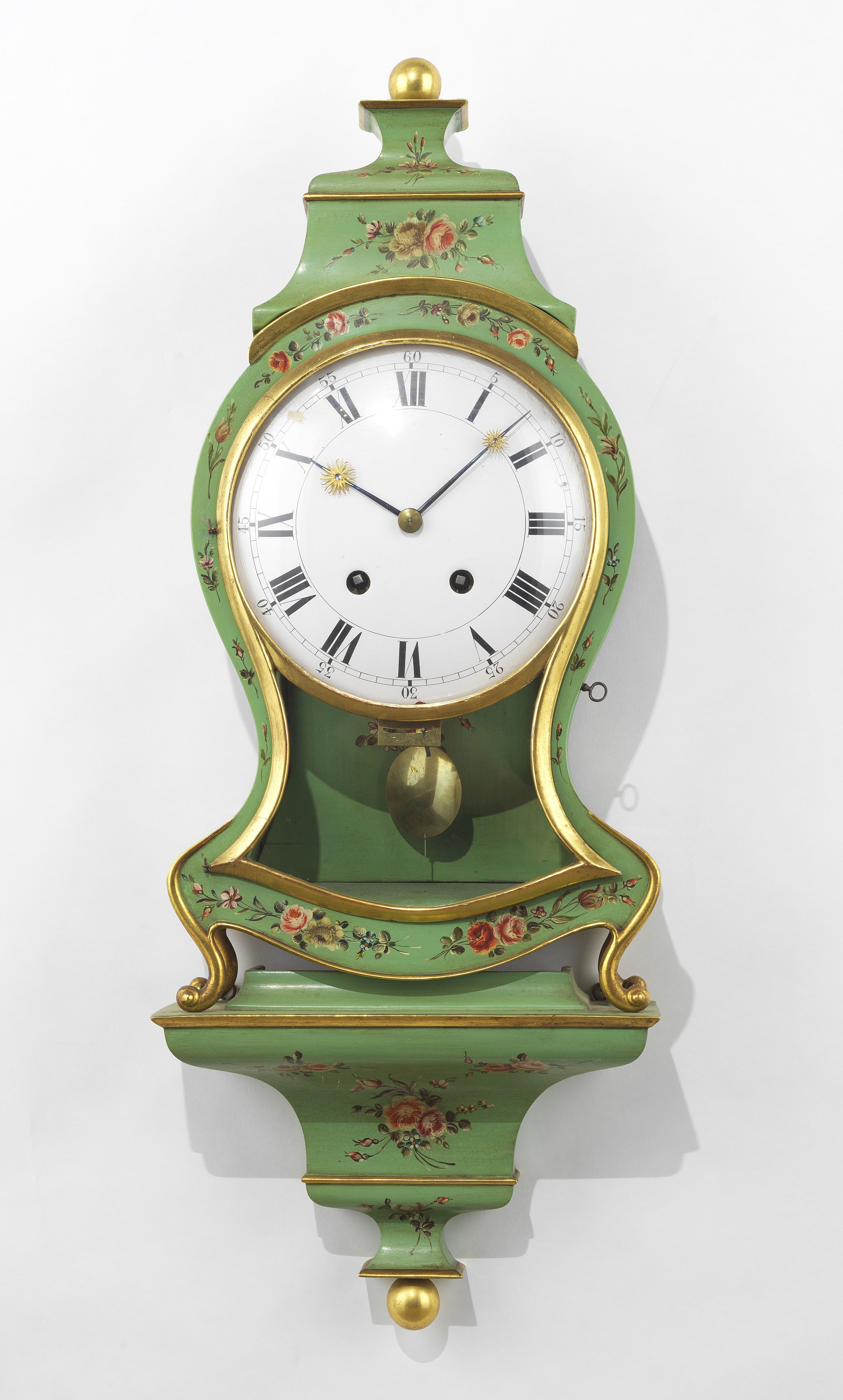 Bois laqué vert et or, cadran émaillé blanc, H 88 cm