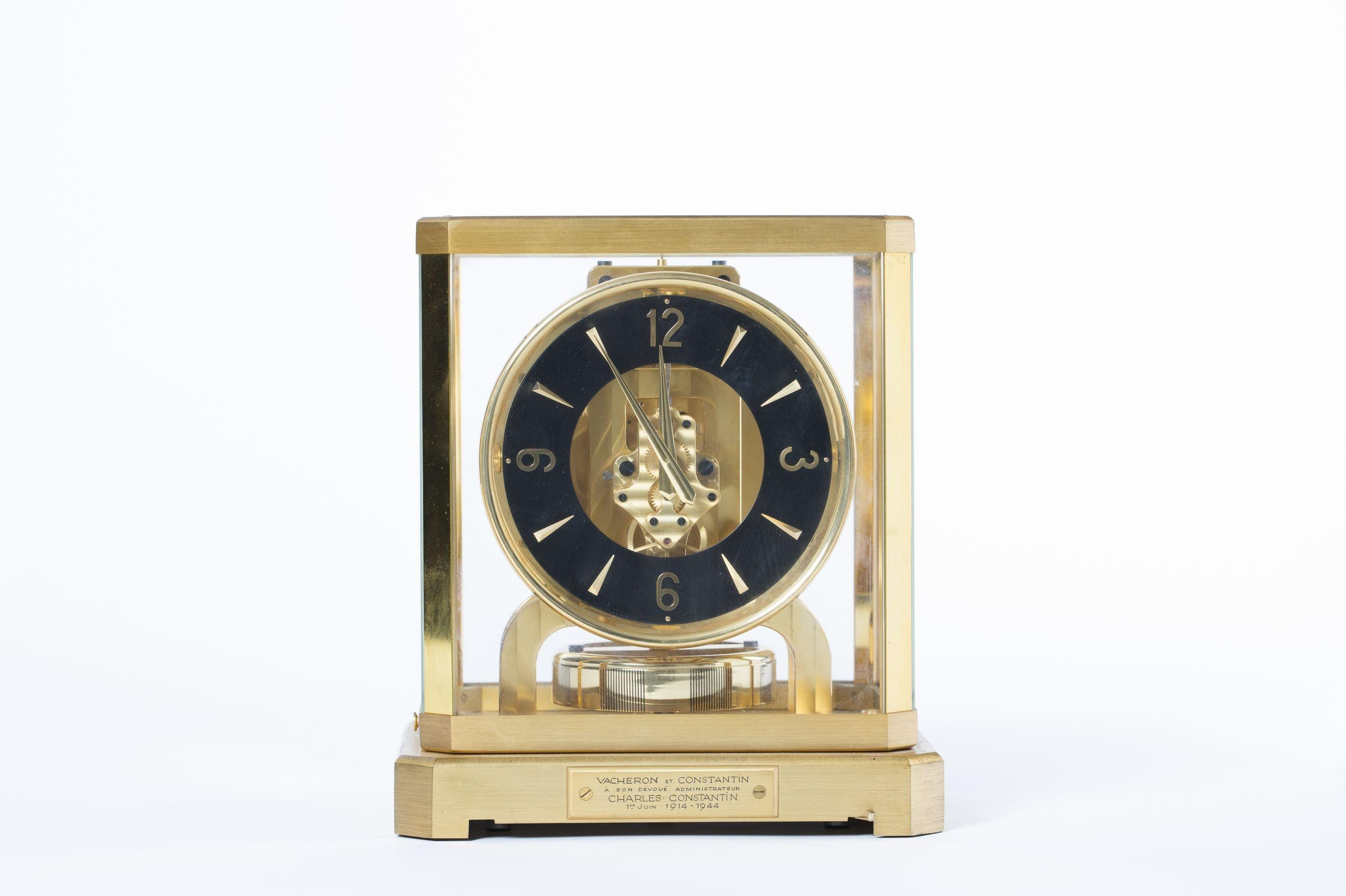 718. Jaeger-LeCoultre, Atmos, pendule cabinet doré portant l'inscription "Vacheron et Constantin, à son dévoué administrateur Charles Constantin 1914-1944"