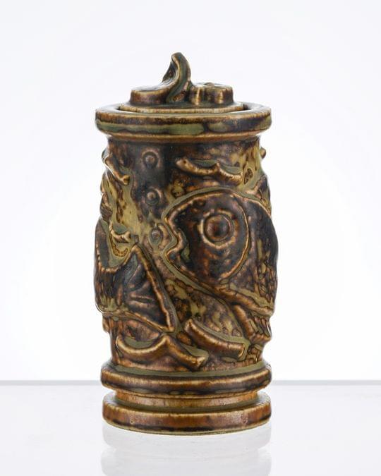 Tabatière à décor de poissons, céramique émaillée brun, signée et numérotée 20101, H 17 cm