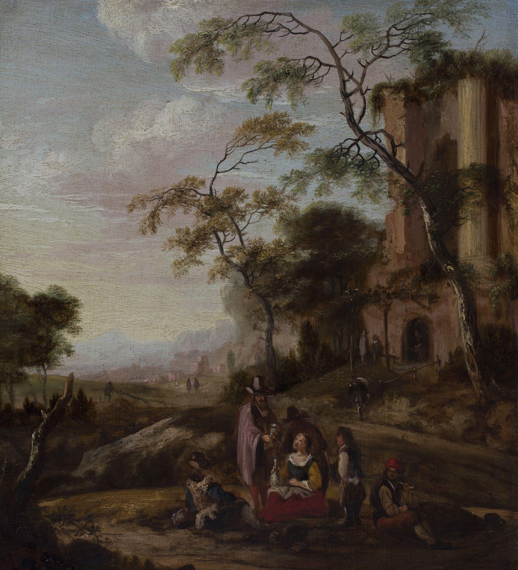 Collation devant les ruines, huile sur panneau signée, 31x27 cm