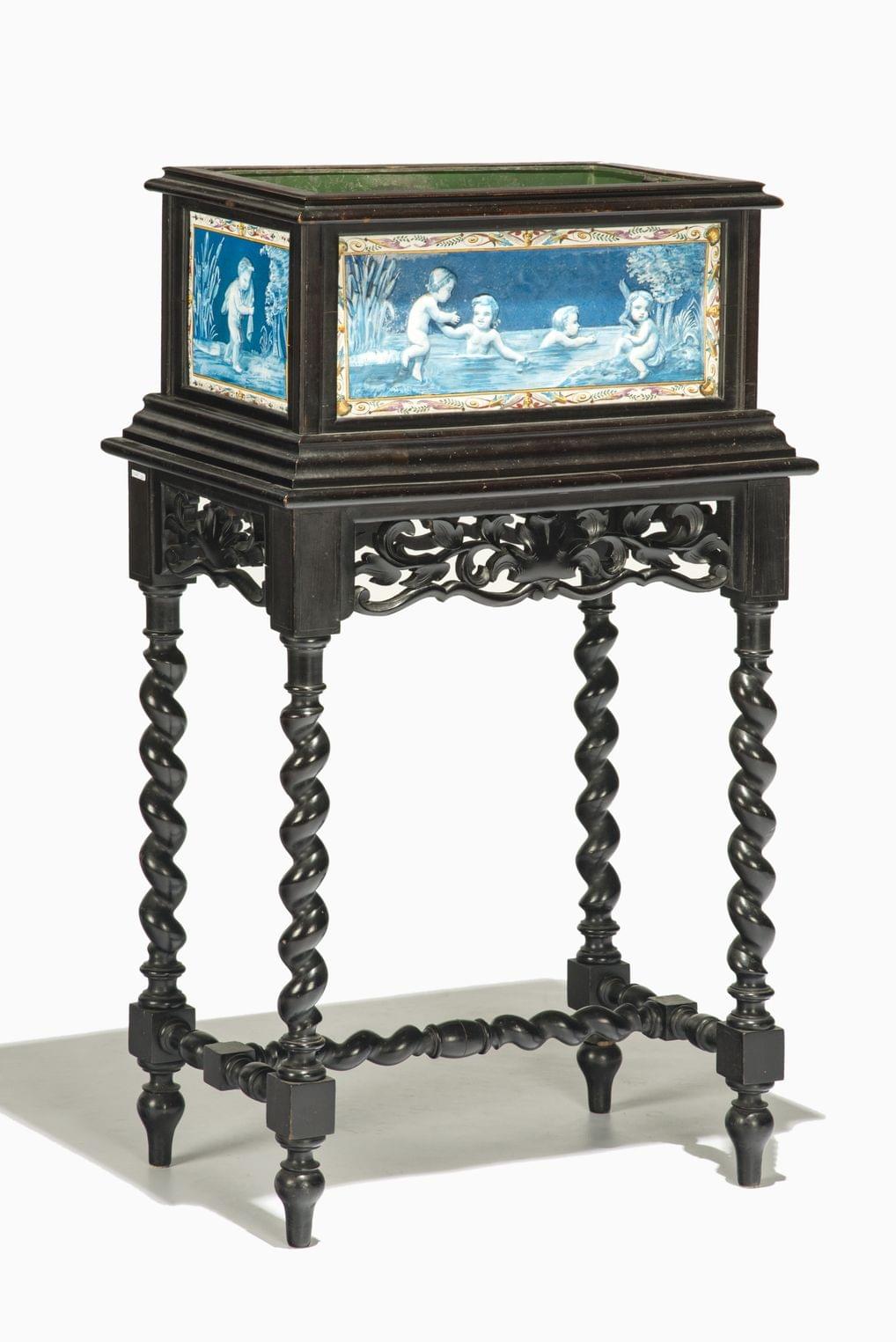 A décor de plaques de faïence émaillées en camaïeu bleu de putti, frises polychromes formées de grotesques, 91x54x35 cm