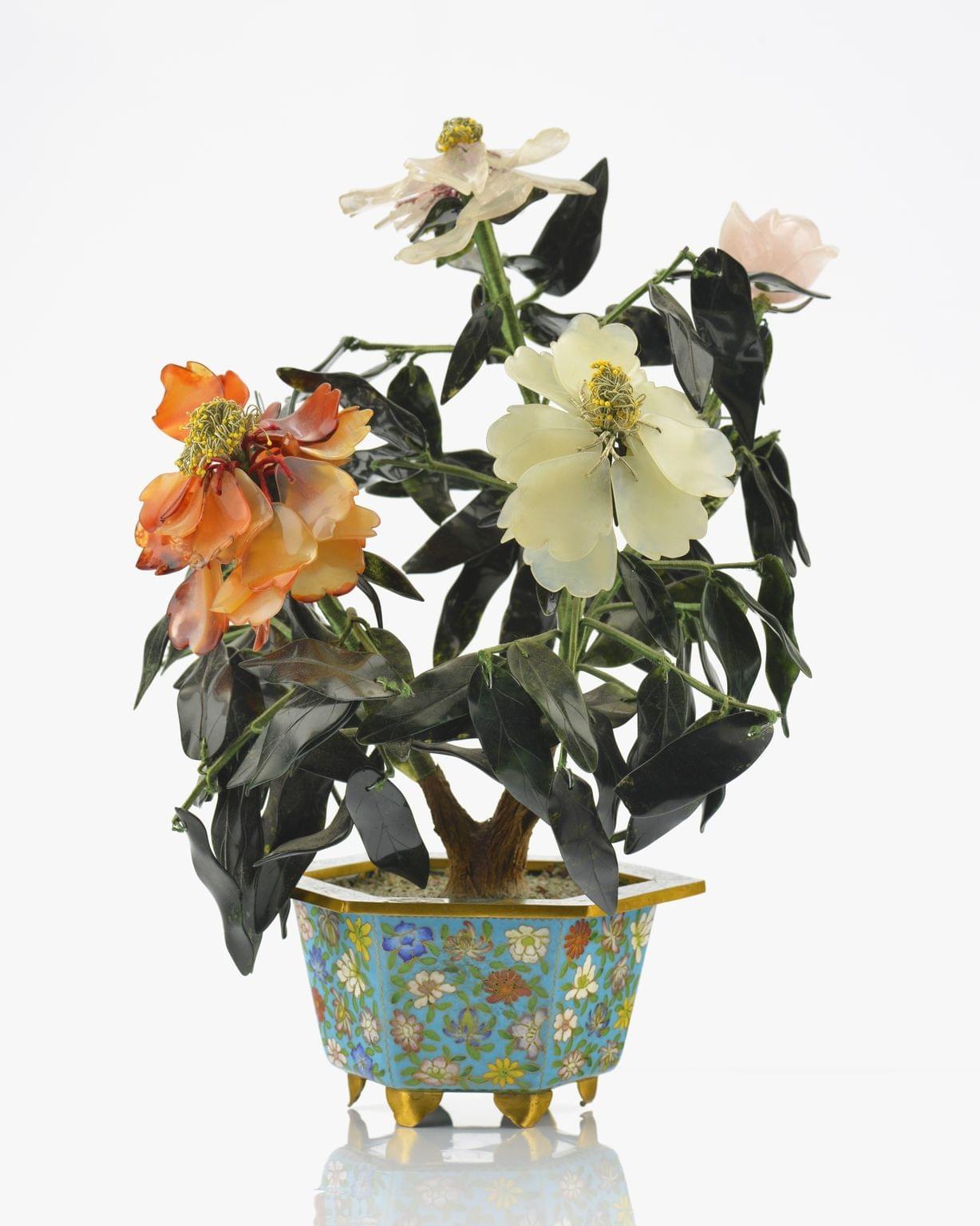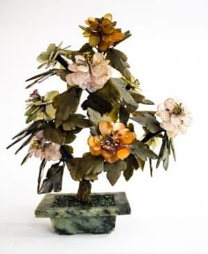 Arbre miniature de pêches et feuilles en pierres dures, H 23 cm
