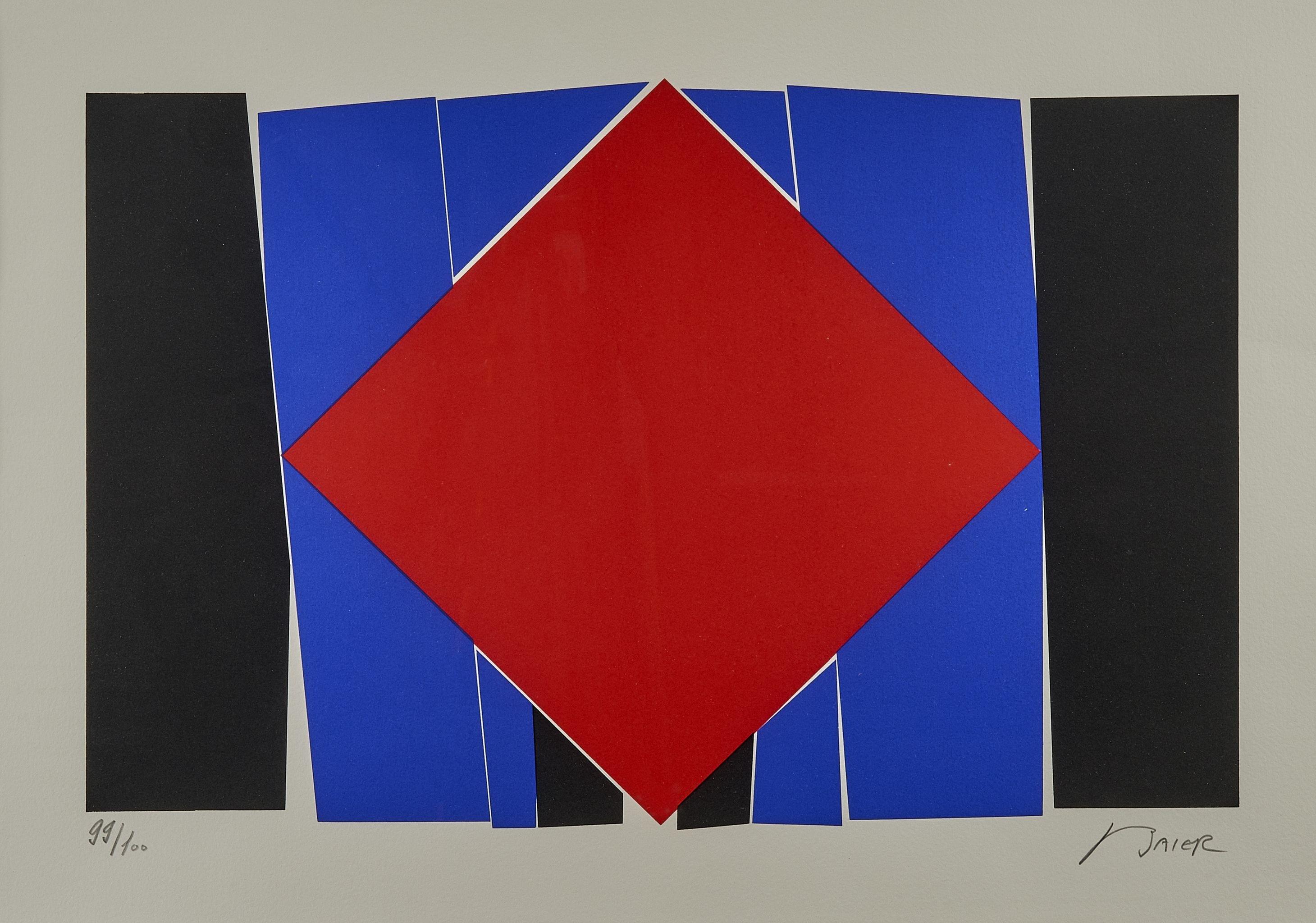 Composition en bleu, noir et rouge, lithographie, signée et numérotée, 99/100, 40x55 cm