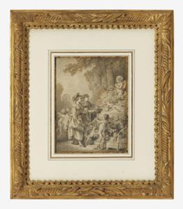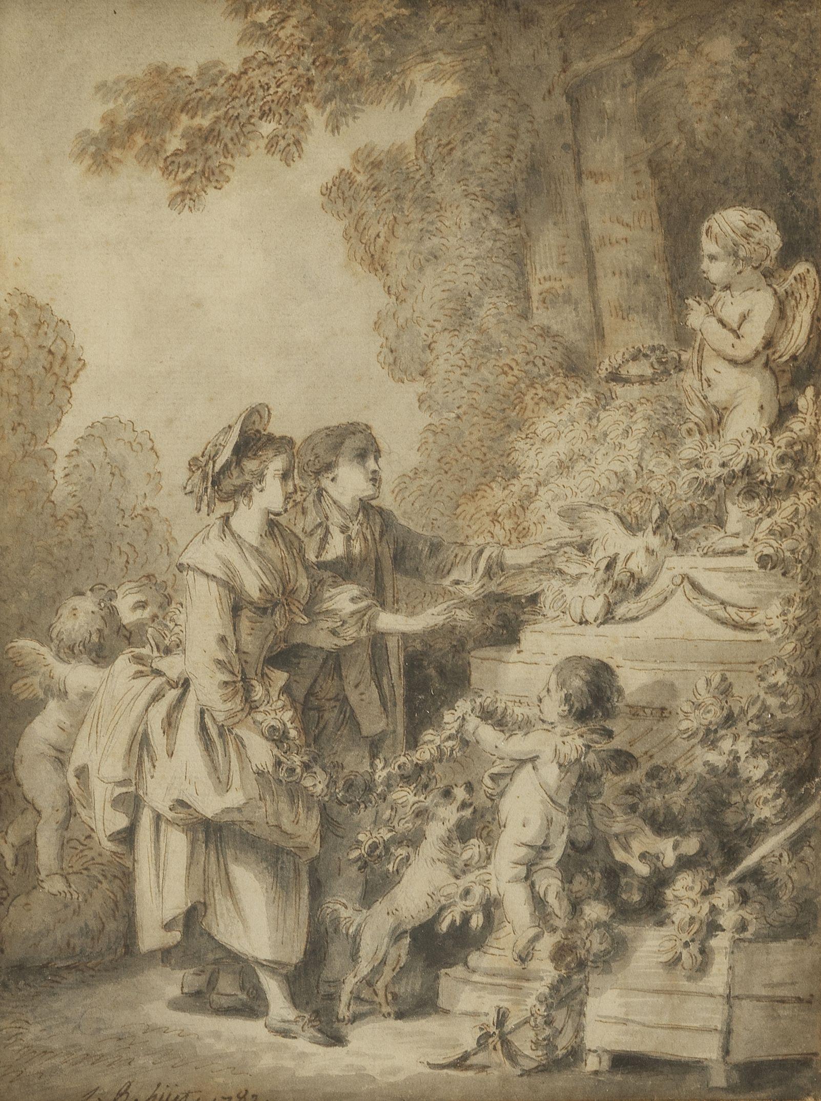 Offrande d'un jeune couple à Amour, encre et lavis sur papier, signé et daté 1782, 23x17 cm. Provenance: Collection privée; Galerie Perrin, Paris, 1989; couple d'amateurs en Suisse