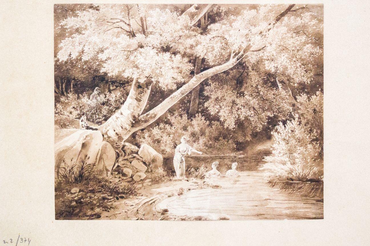 Femmes au bain surprises par un chasseur, lavis sur papier, signé, 19x24 cm