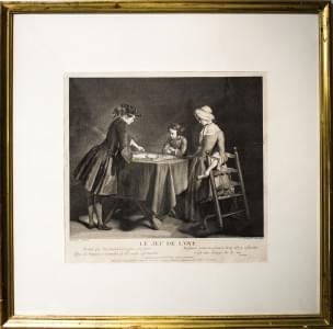 Les tours de cartes et le jeu de l’oye, deux gravures par Surugue fils, 31x32 cm