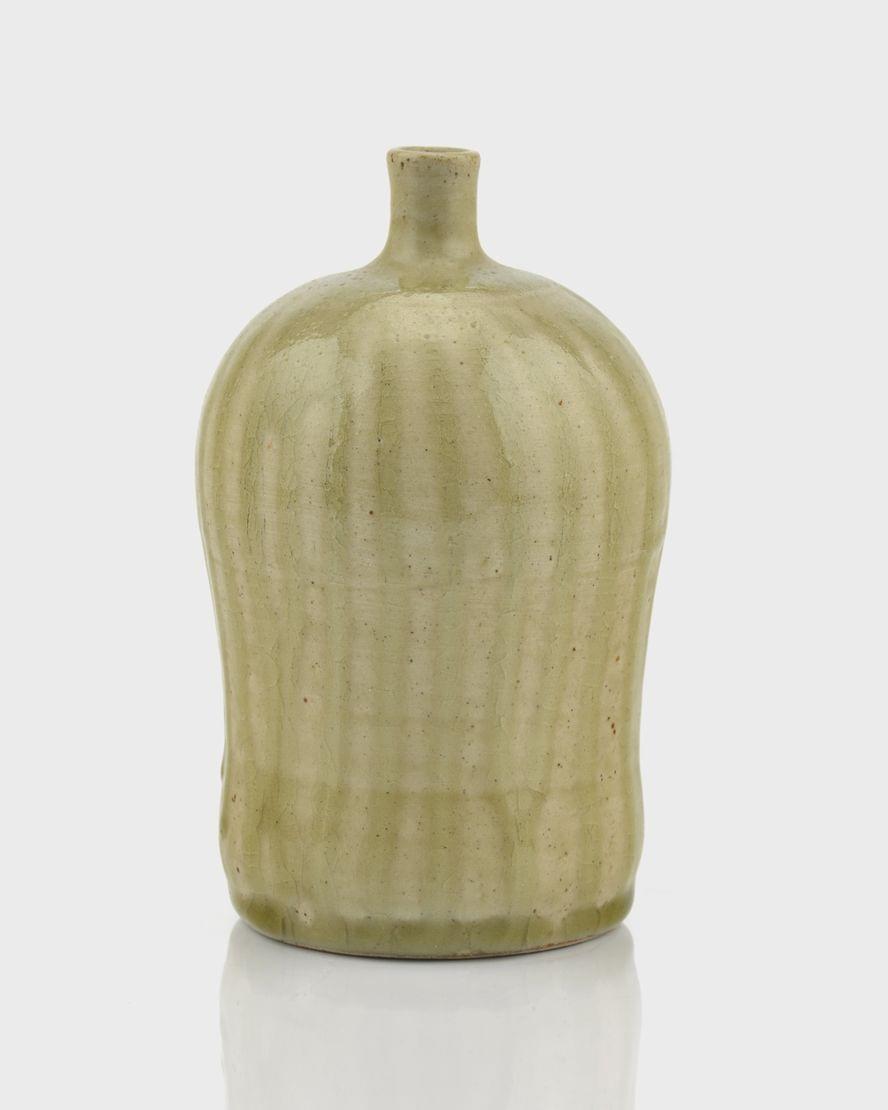 Bouteille à saké, grès émaillé à coulures vert eau sur fond beige, signé et numéroté 3, H 14,5 cm