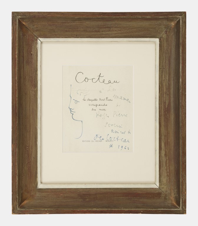 Profil, et envoi autographe « A la maman de Roger Pierre, souvenir amical de Jean Cocteau * 1960 » sur la page de titre de la chapelle Saint Pierre, feutre bleu, 24x19 cm