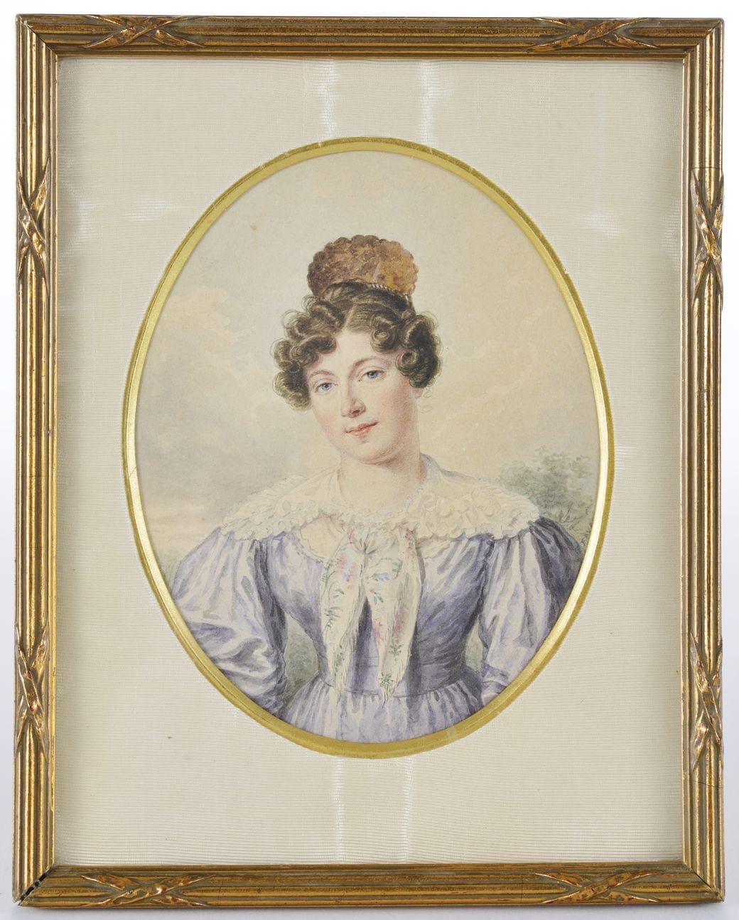 Portrait de jeune femme, aquarelle ovale sur papier,14x11 cm