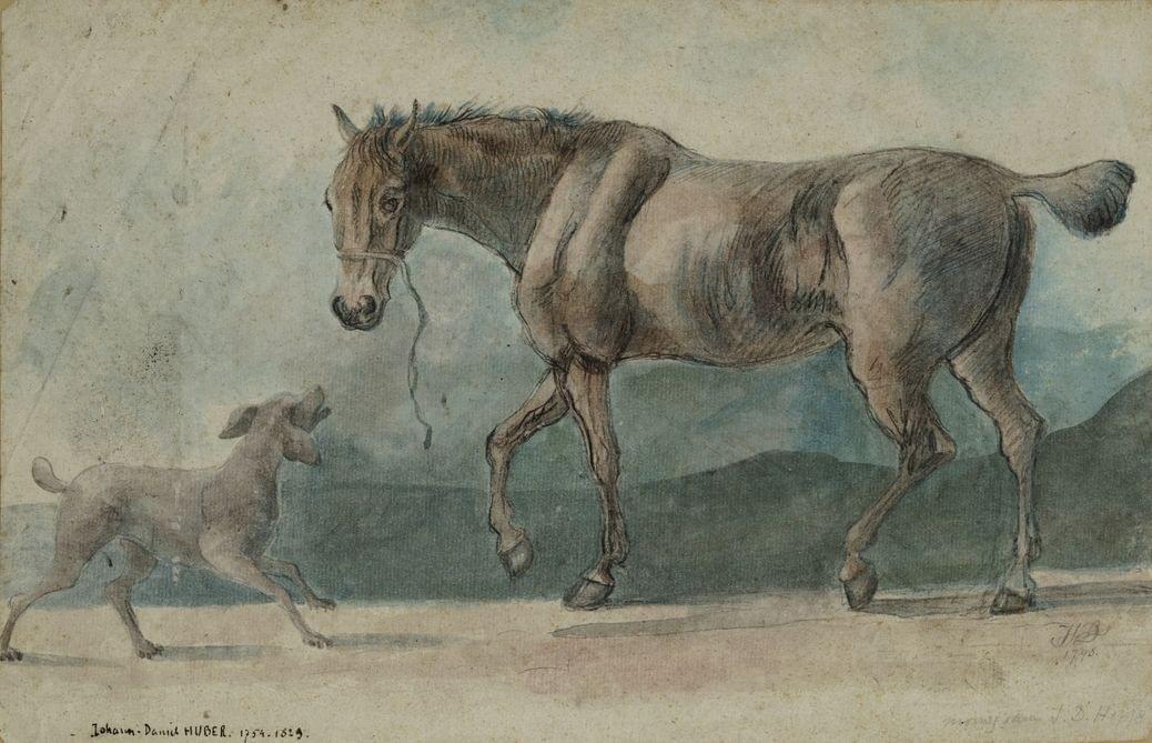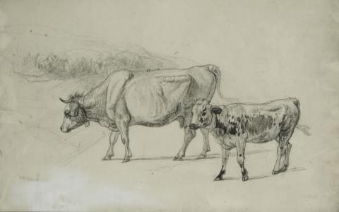 Vache et son veau et Cheval et chien, deux mines de plomb sur papier, l'une aquarellée, monogrammée et datée 1798, l'autre portant le cachet, 26x40 et 22x33 cm