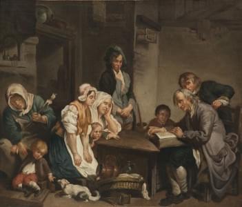Père lisant la bible à ses enfants, huile sur toile, XVIIIe s, 7...