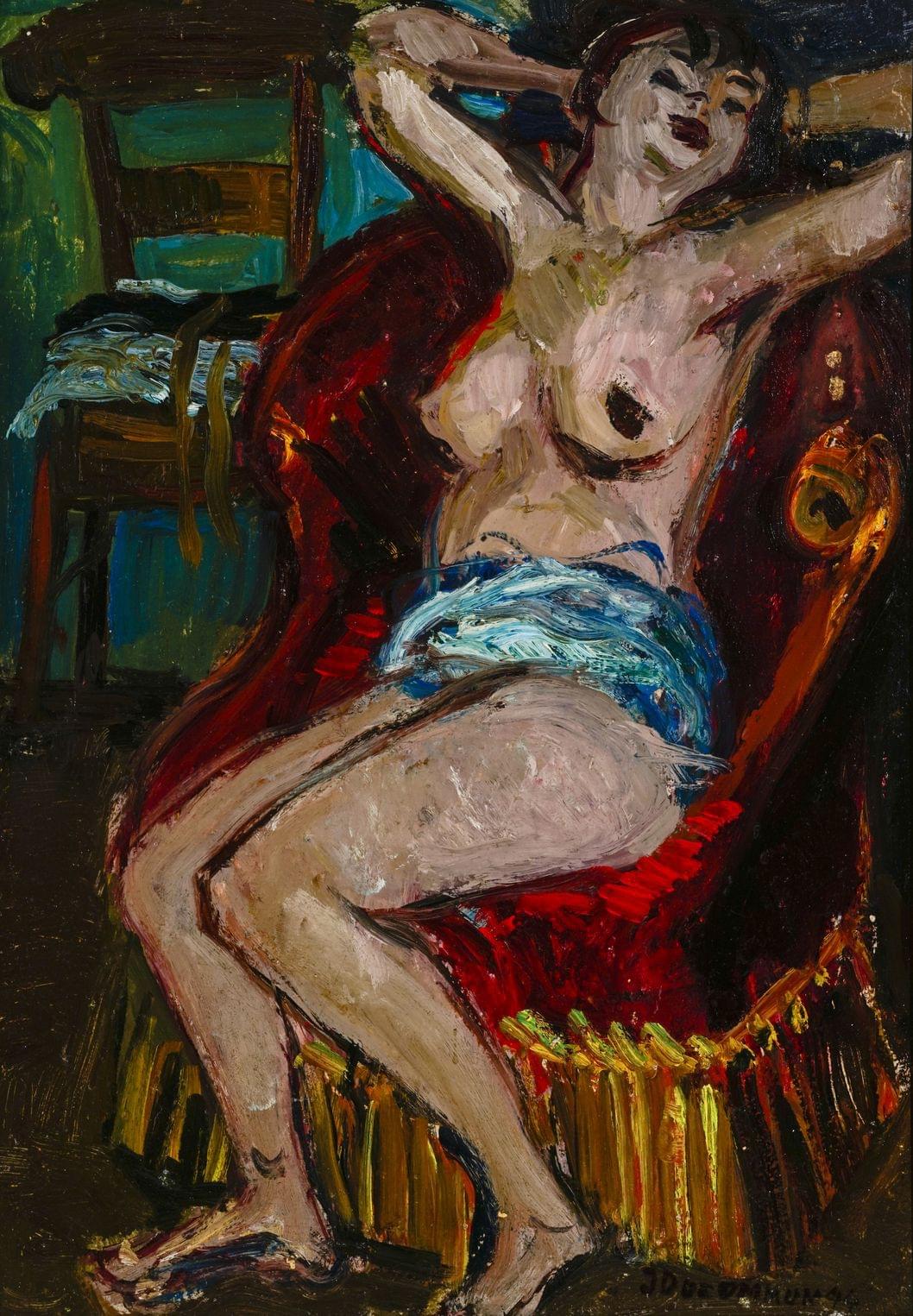 Élégante avec chapeau, encre sur carton marouflée sur toile, sig...