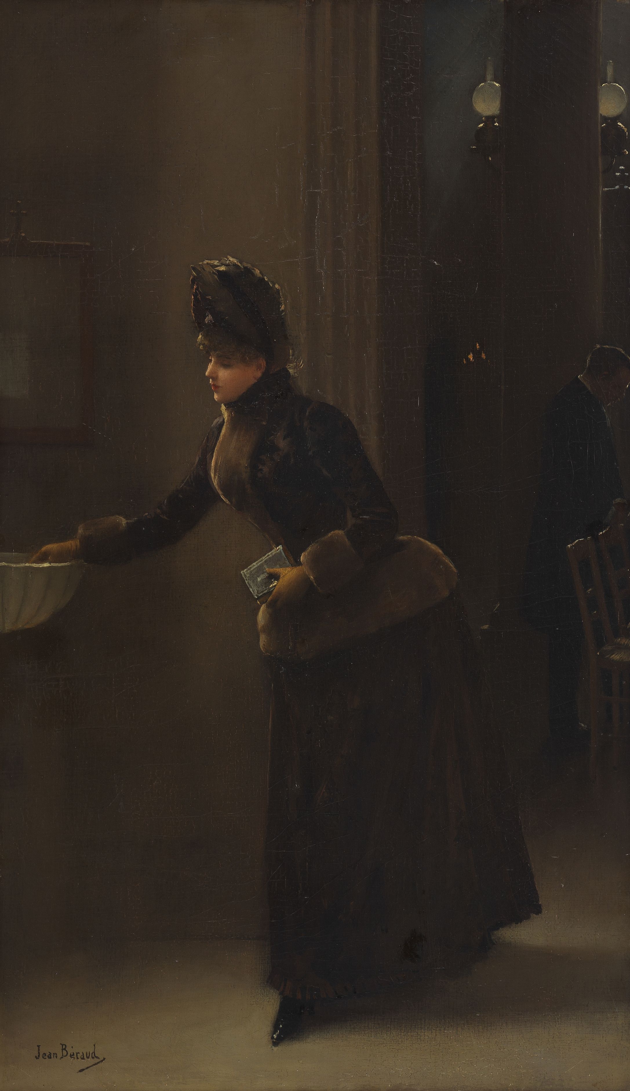 Femme élégante dans un vestibule, huile sur toile, signée, 65x39...