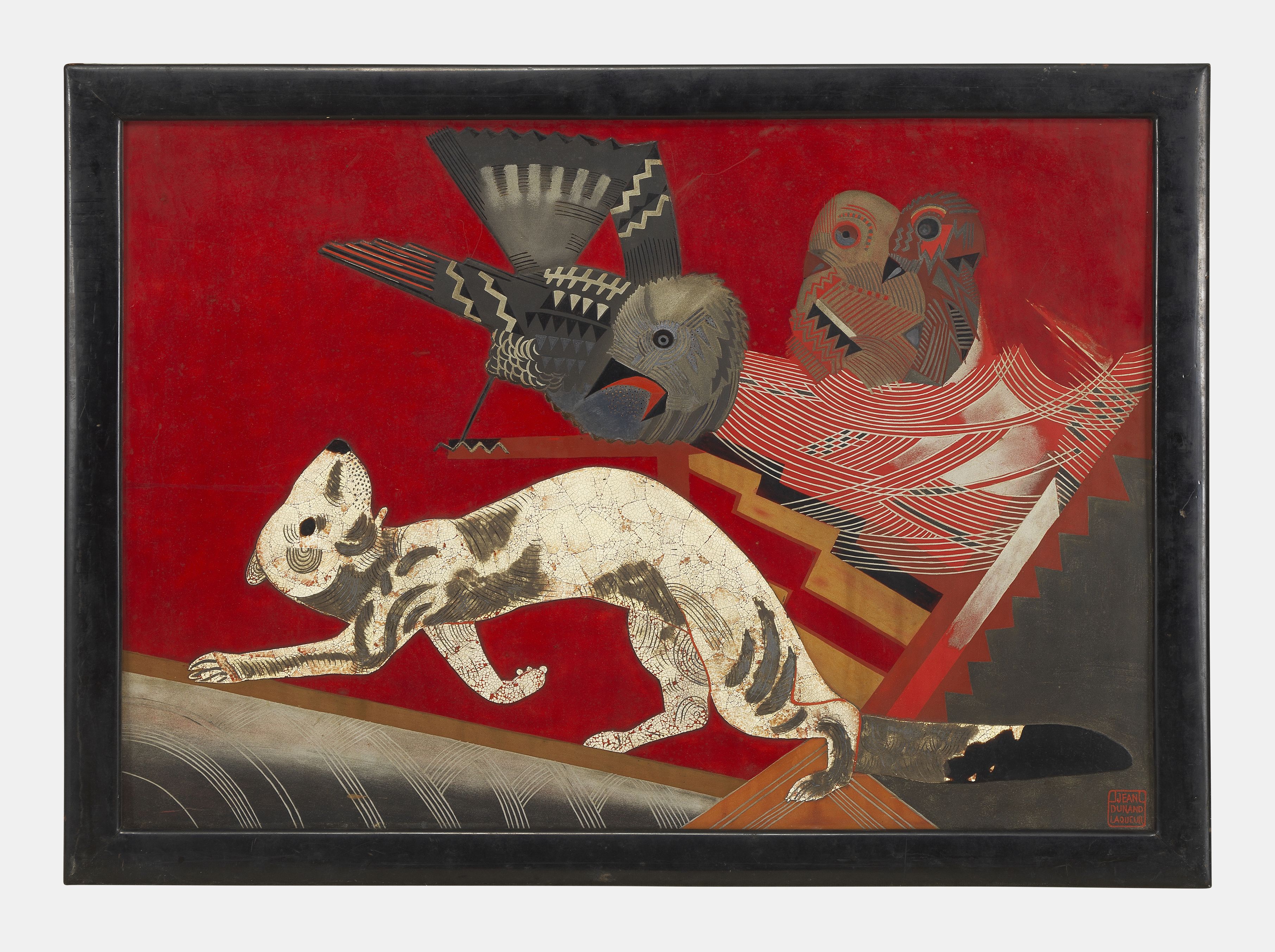 Hermine (1923), panneau en laque et coquille d'œuf, 50x69 cm. Littérature: panneau en pendant illustré dans l'ouvrage : "Jean Dunand His life and his work" par Félix Marcilhac, no 310, p 235. Provenance: Les Stern, une famille de collectionneurs.