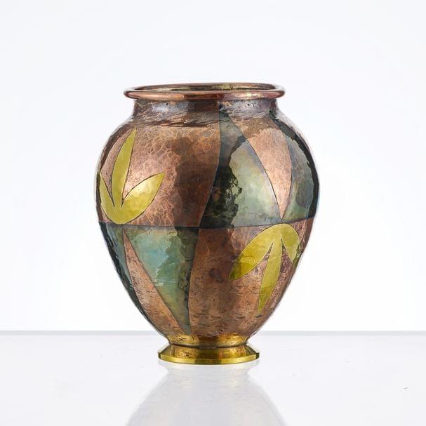 Vase pansu Art Déco à décor géométrique, cuivre, laiton et argent, signé sous la base, H 11 cm