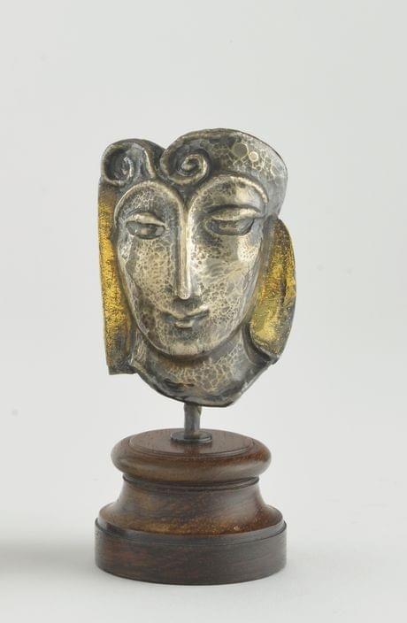 Masque visage de jeune homme, argent 925 et socle en bois, H 14 cm