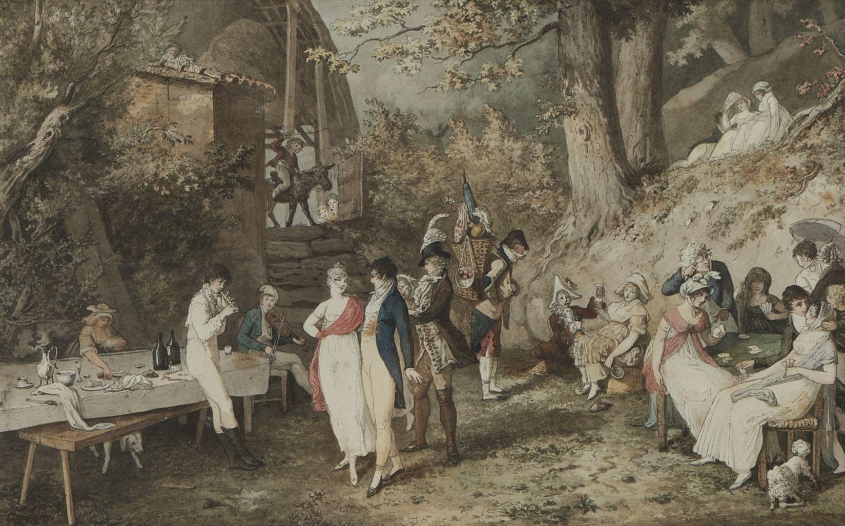 Fête champêtre, encre et aquarelle sur papier, 19x30 cm
