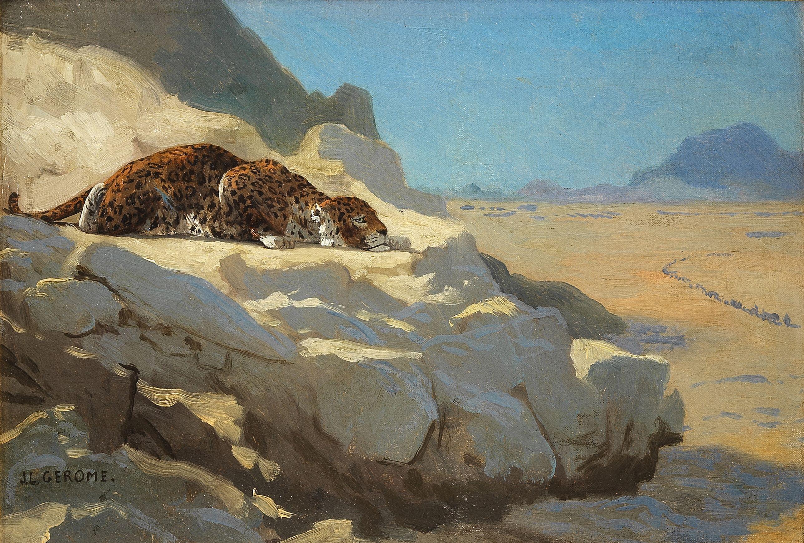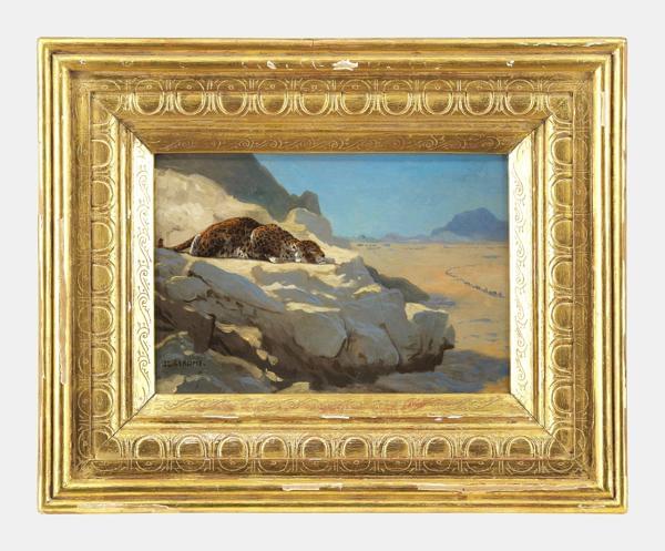 Léopard aux aguets, huile sur toile, signée, 24,5x35,5 cmProvenance:- Vente anonyme, Hôtel Drouot, Paris, 26 mars 1953- Orr's Gallery, San Diego, CA, 1968- Maxwell Galleries, Ltd., San Francisco, CA, 1973- Floyd E. Estrom, San Francisco, 1978- Mathaf Gallery, London (titré "A Leopard"; étiquette partielle de la galerie au dos)- Collection privée suisseNous remercions chaleureusement le Dr Emily M. Weeks pour son aide dans la rédaction de cette notice. L'acheteur aura la possibilité de demander un certificat écrit au Dr Weeks contre rémunération.