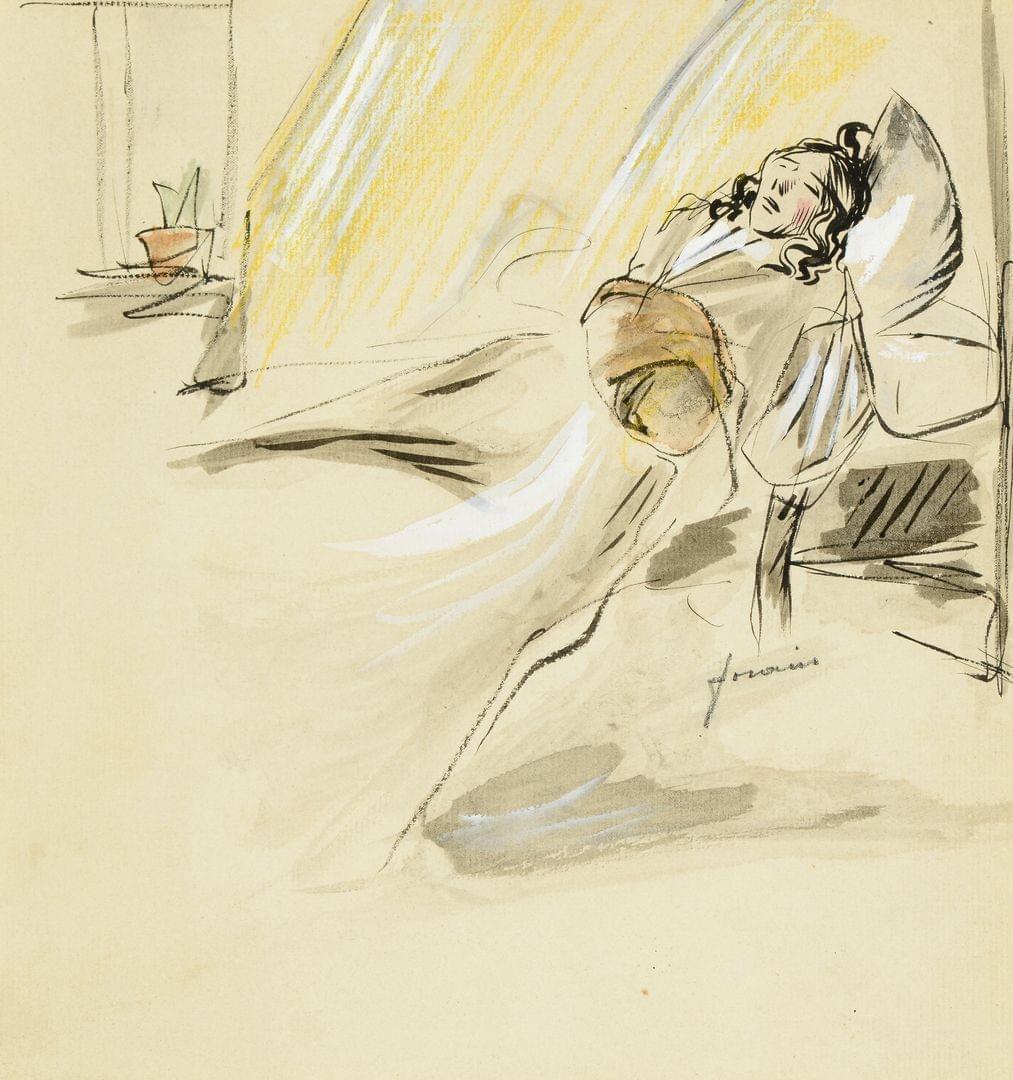 La mort de Mimi dans La Bohème de Puccini, aquarelle et gouache sur papier, signée, 23x24 cm