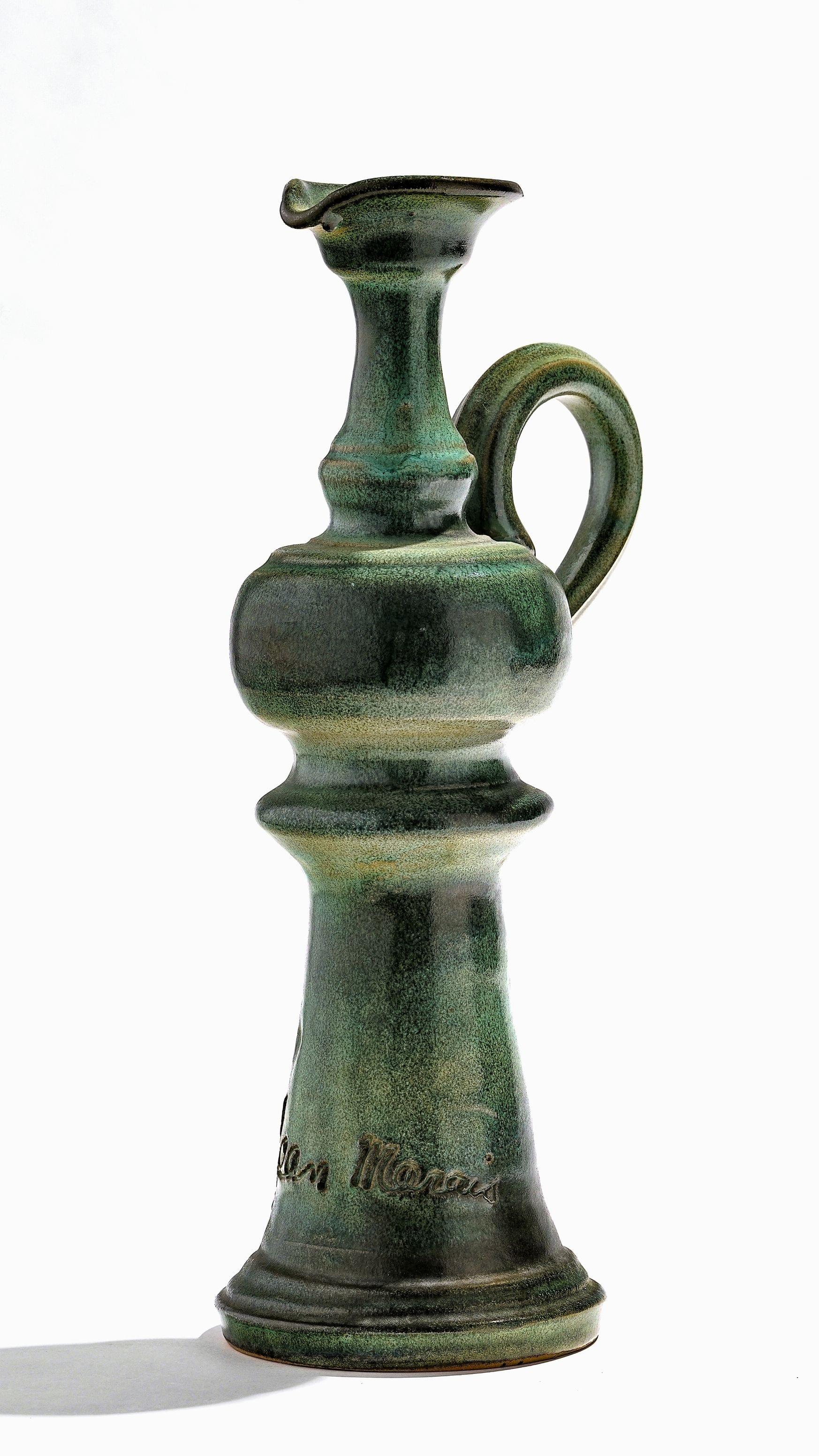 Coupe couverte à deux anses, céramique, signée, H 12 cm