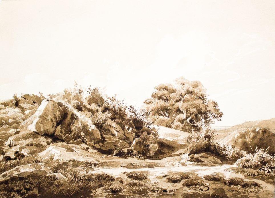 Campagne genevoise, aquarelle sépia sur papier, signée, 15x22 cm