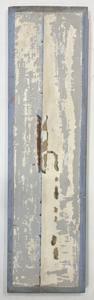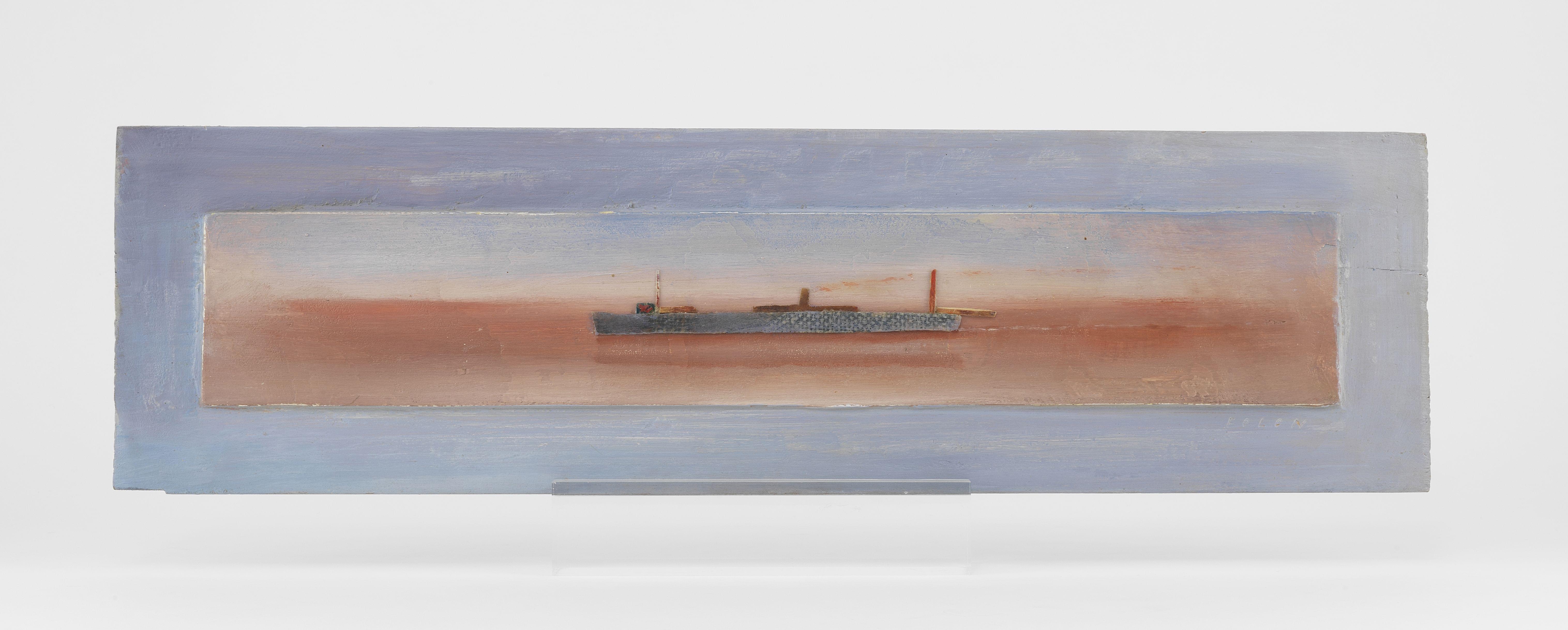 Marine, panneau double-face, technique mixte, huile et collage d'éléments en carton, bois et divers matériaux, signé, 15,5x57,5 cm
