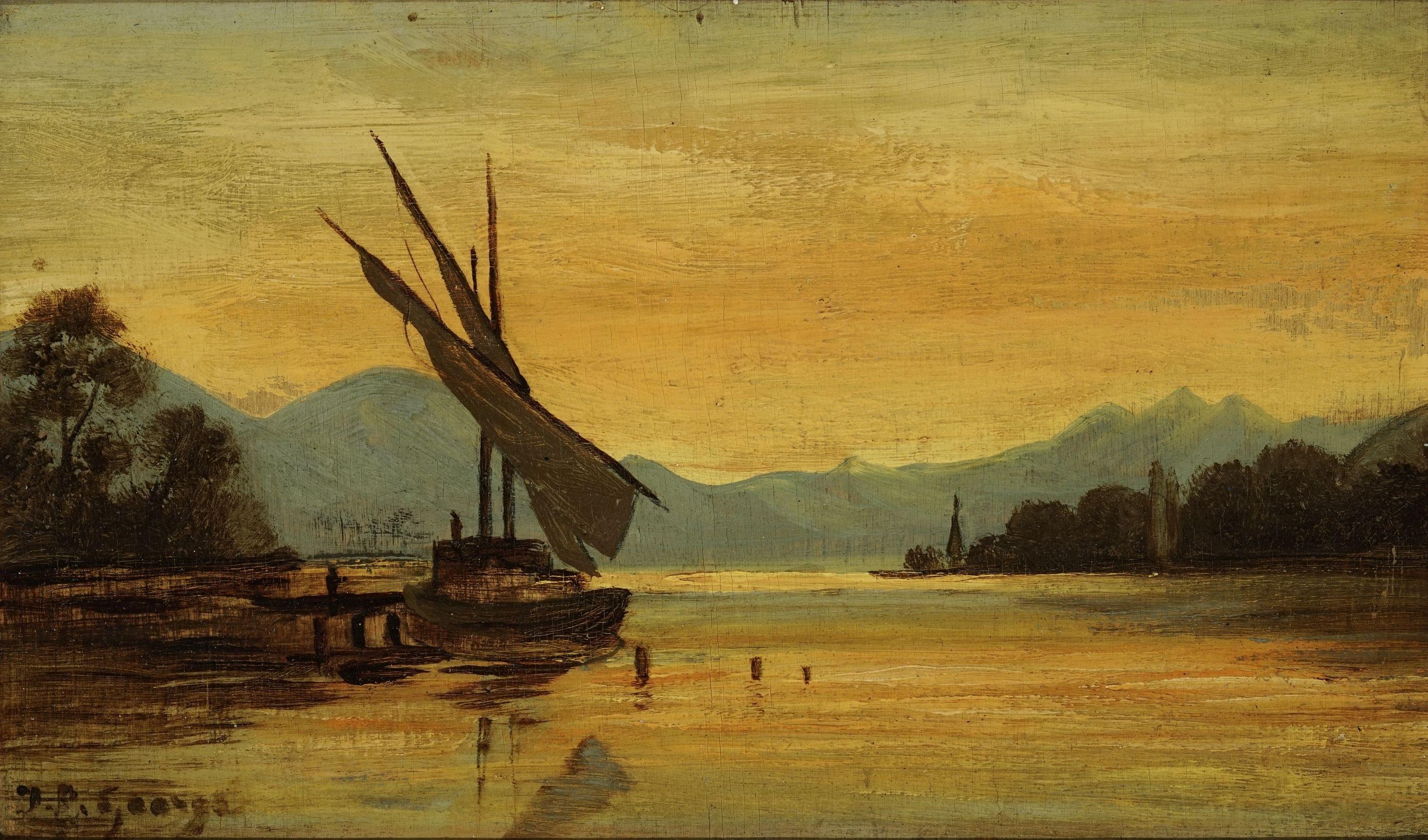 Barque au soleil couchant, huile sur carton, signée, 15x23 cm