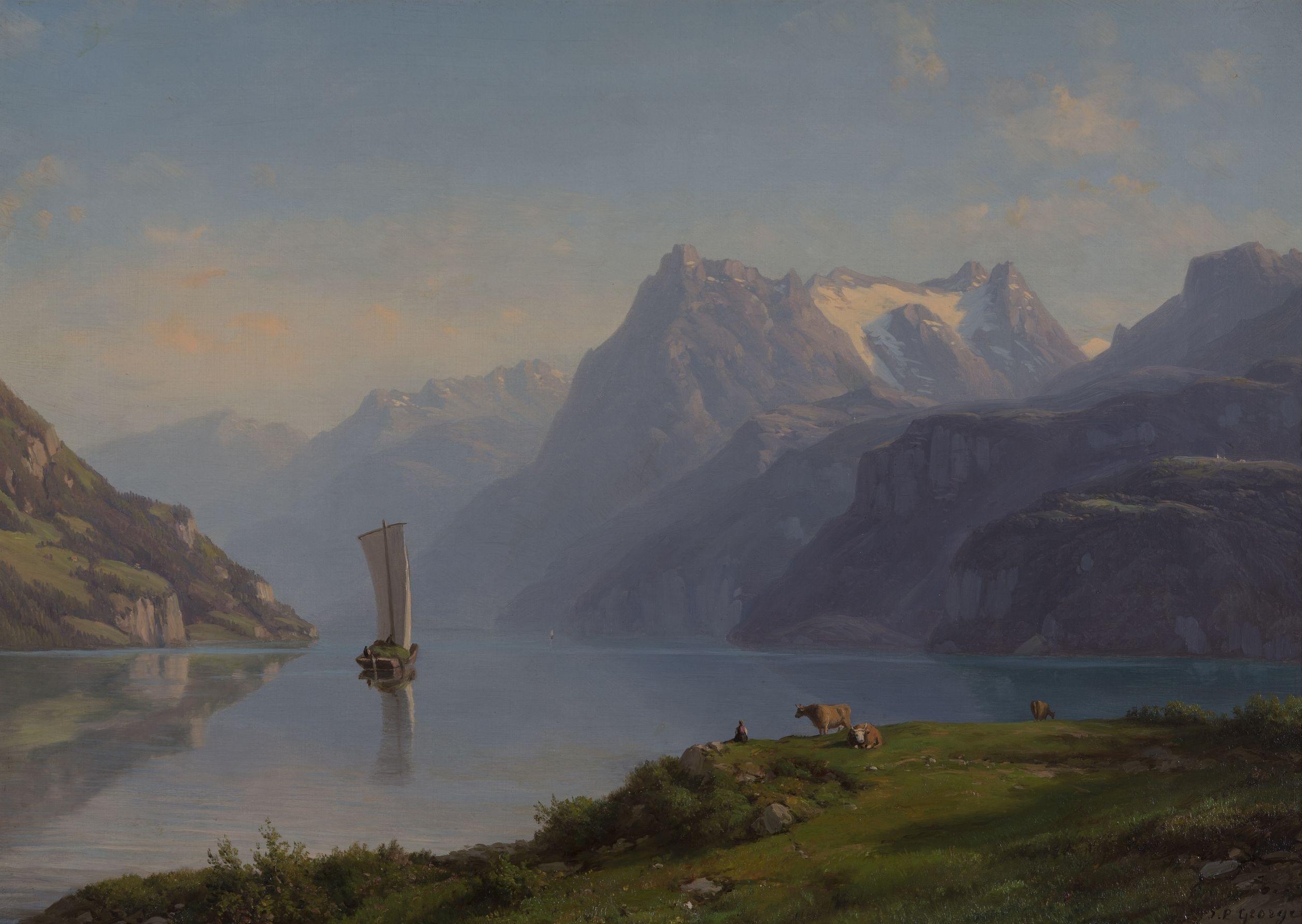 Paysage lacustre, huile sur toile, signée, 45x64 cm