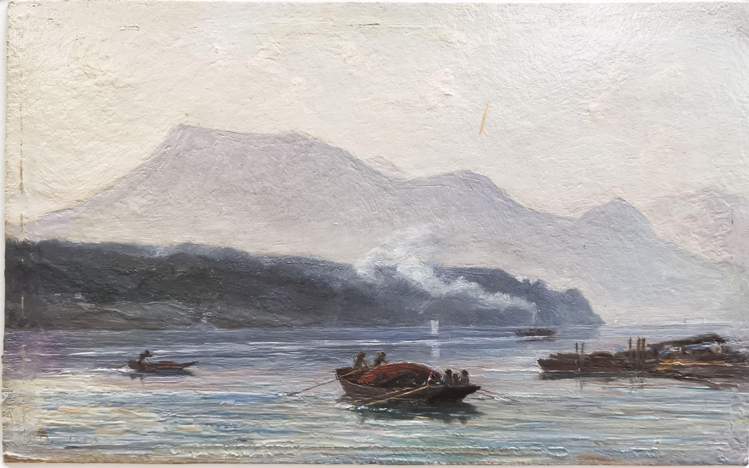 Pêche lacustre, huile sur carton, monogrammée et datée 1883, 16,5x25,5 cm