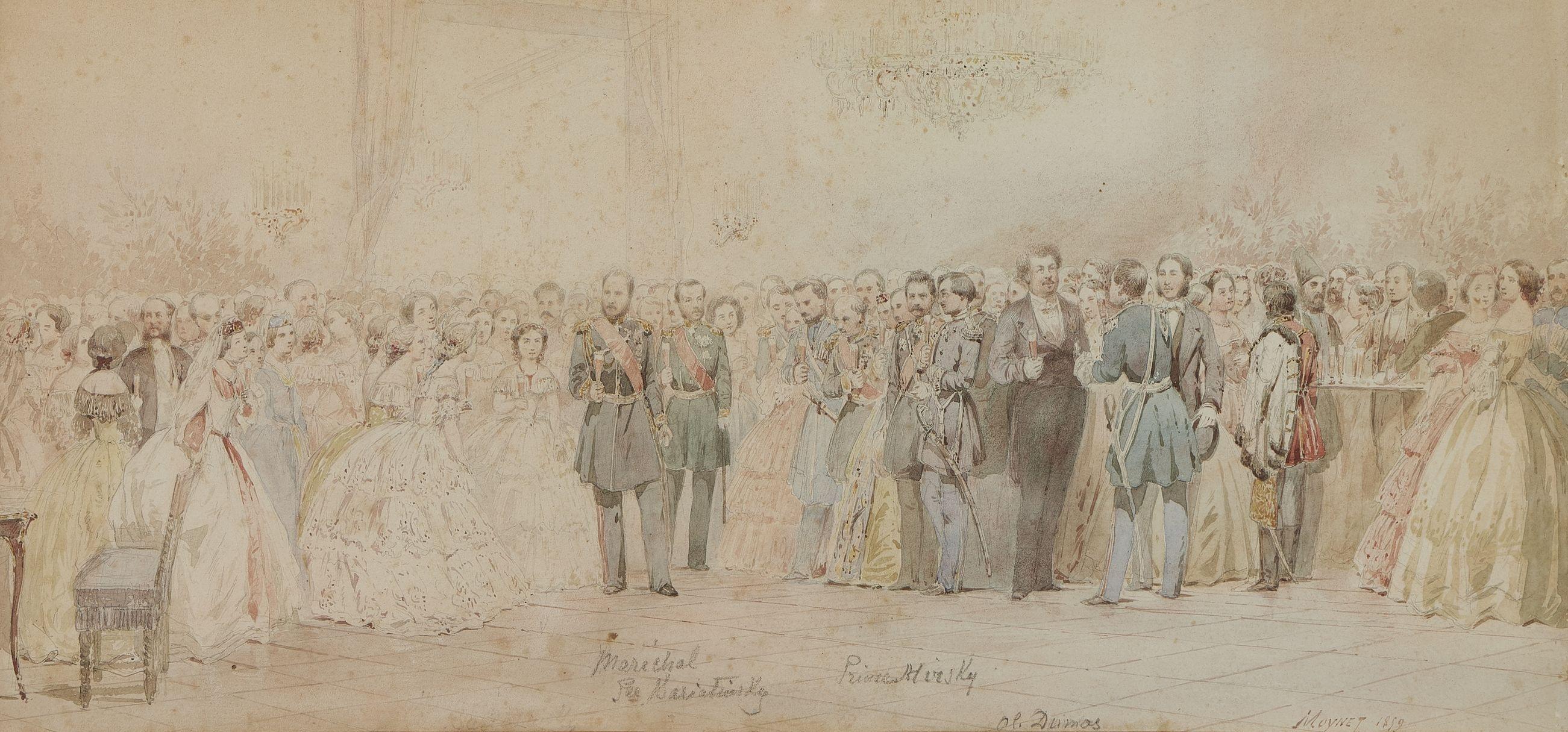 Réception chez le Maréchal Prince Poniatowsky en présence du prince Minsky et d'Alexandre Dumas, aquarelle sur papier, signée et datée 1859, 20x43 cm