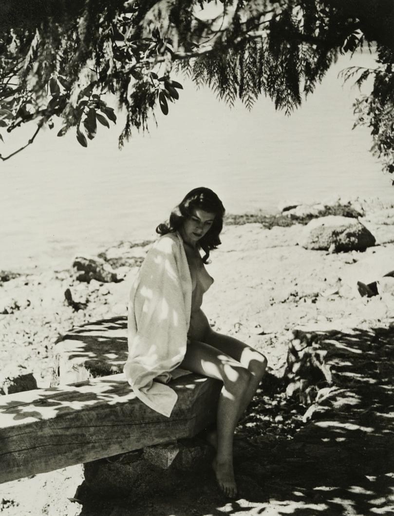 Jeune femme assise au bord de l'eau, tirage argentique en sépia, 19x15 cm