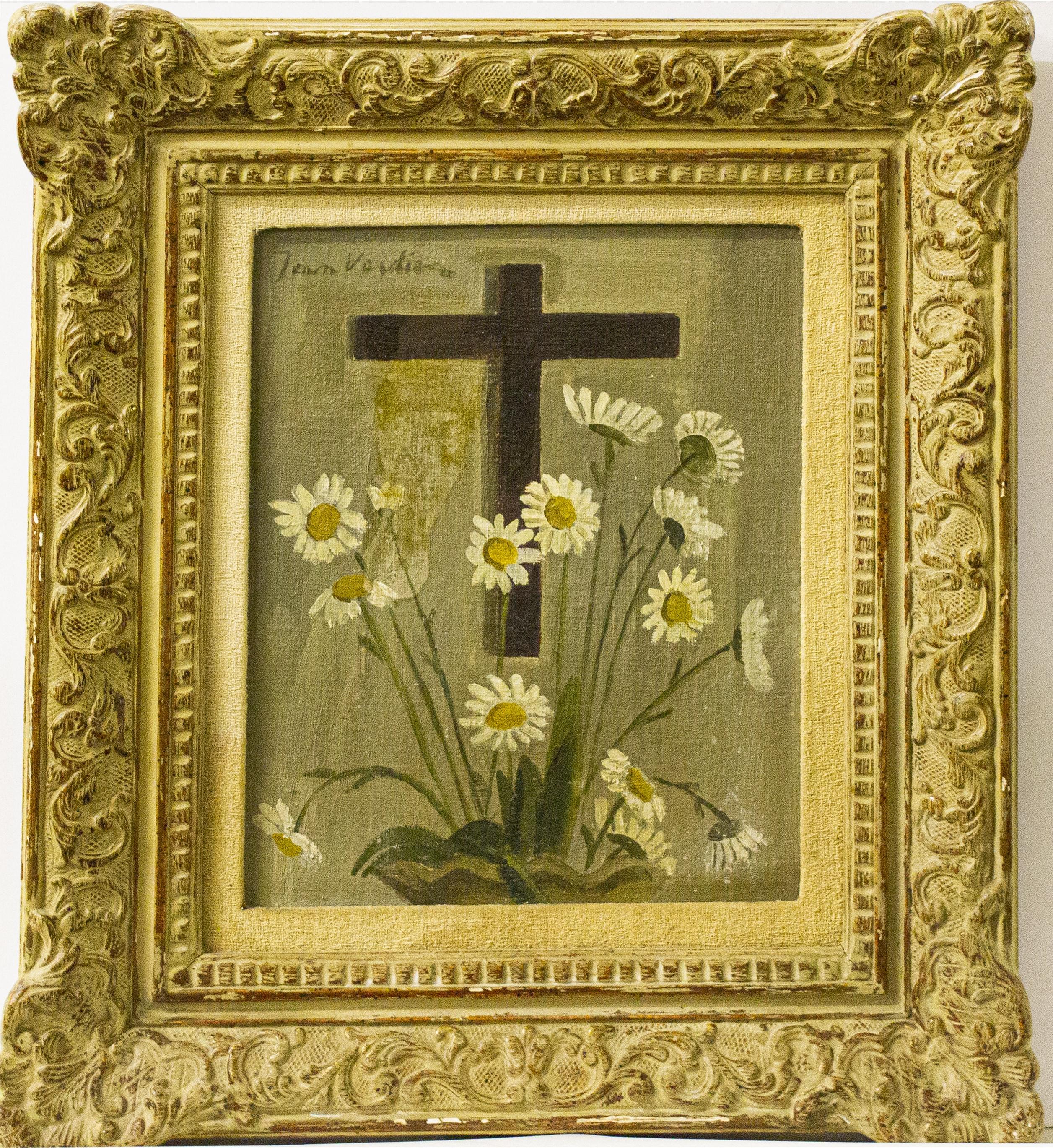 Crucifix aux marguerites, huile sur toile, signée, 27x22 cm