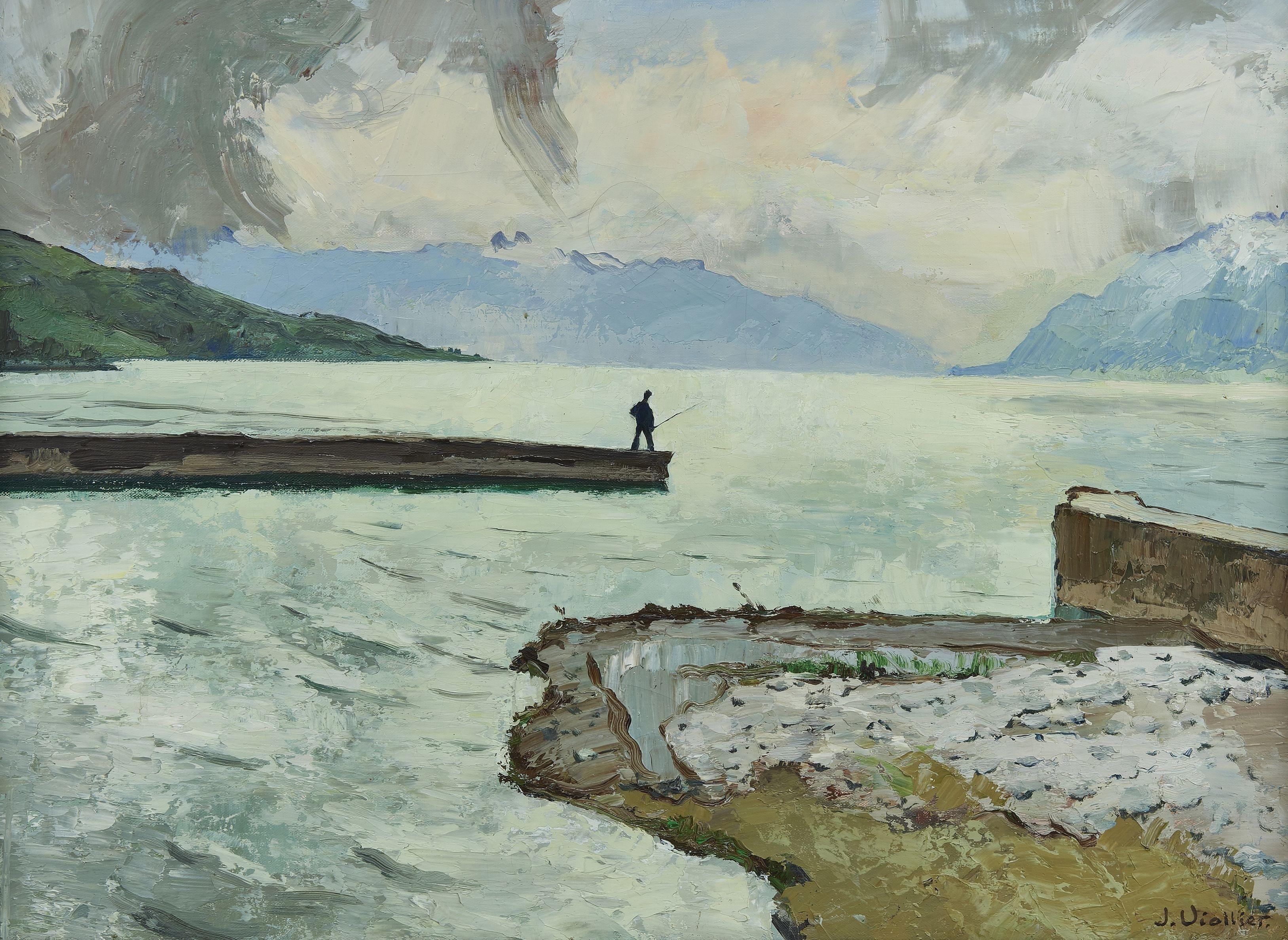 Lac par temps couvert, huile sur toile, signée, 54x73 cm. Exposition musée cantonal des Beaux-Arts, Lausanne, les peintres du Léman 1944. On joint un catalogue.