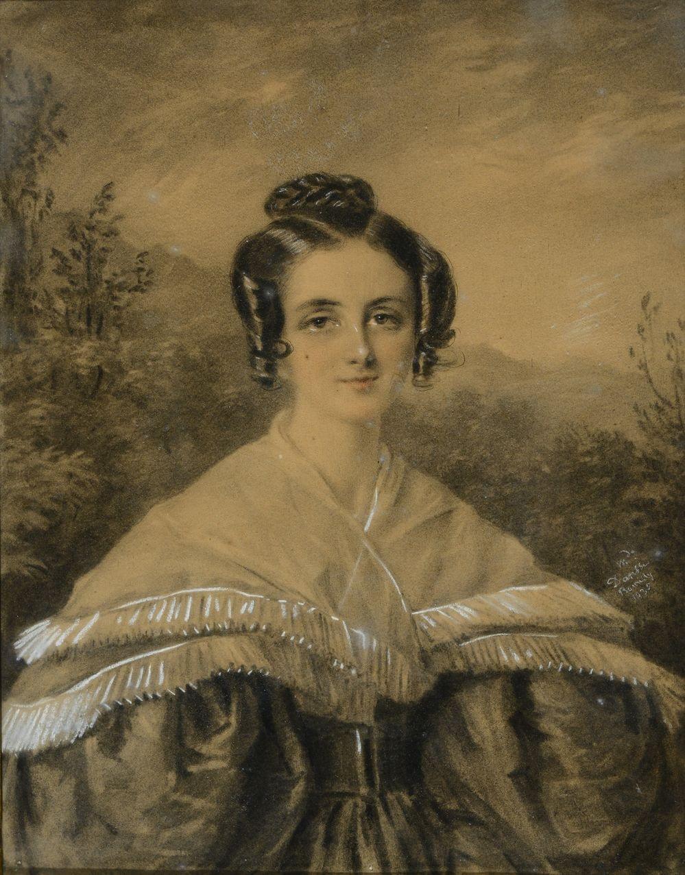 Portrait de Madame Jacqueline Cécile Lesslin, fusain et gouache sur papier, signé, 24x19 cm