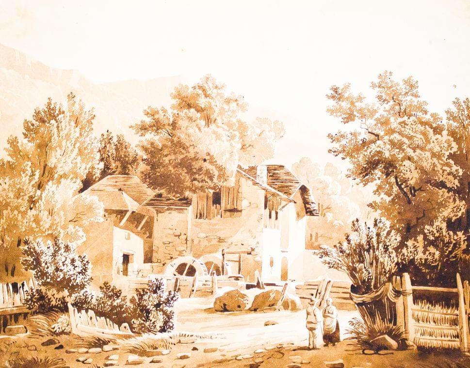 Anciens moulins, aquarelle sépia sur papier, signée, 18x24 cm